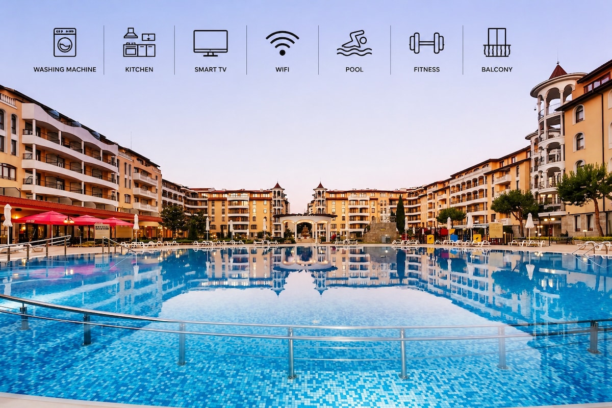 Stylish apartment in Harmony Suites Grand Resort with beautiful pools, gardens and a sunny balcony. Ideal for couples, small families and guests looking for a relaxing stay in Sunny Beach. The apartment offers fast Wi-Fi, a fully equipped kitchen, a comfortable living area and everything you need for a pleasant summer stay. The beach is about 600 m away, and Nessebar is also easy to reach. Perfect for beach holidays, pool days and relaxed evenings in a high-quality resort setting.