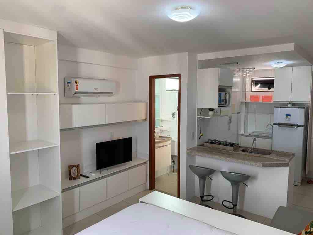 Você vai se sentir em casa, nesse aconchegante flat tipo estúdio, mobiliado com TV Smart, Ar-condicionado Split, geladeira, cooktop, microondas, sanduicheira, cafeteira,liquidificador, secador de cabelos, ferro de passar. Conta com uma cama de casal, mesa, cadeiras e utensílios para cama, mesa e banho. Você fará self check in se identificando na portaria e tendo acesso ao ap através de senha fornecida pela anfitriã. Dispomos de porteiros 24h que facilita o check in e check out.