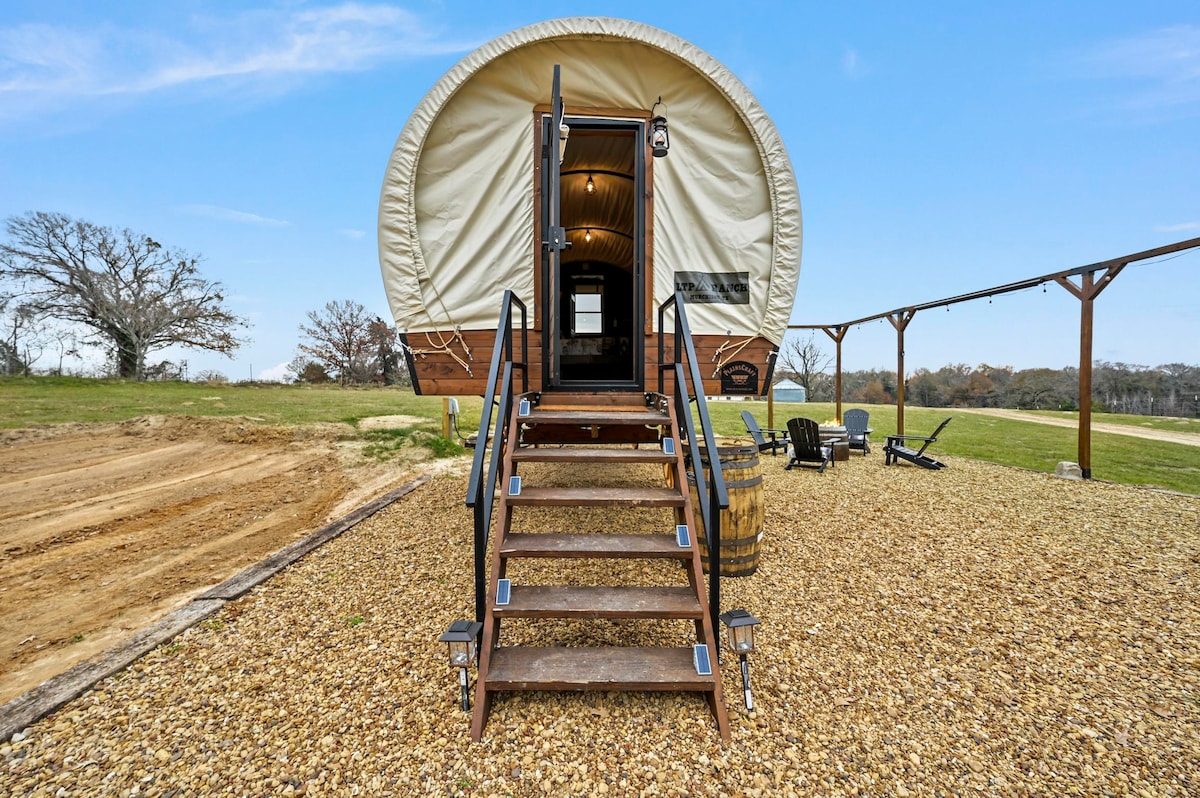 Recently selected as Texas #2 unique stay. Private covered wagon retreat near Canton featuring a seasonally heated stock tank soak & exclusive gold sluice experience. Relax under string lights, pan for gold, and unwind on a quiet Texas ranch just minutes from First Monday Trade Days. Climate-controlled wagon with full bath, outdoor movie screen, fire pit, and private patio. Perfect for romantic getaways or memorable weekend escapes.