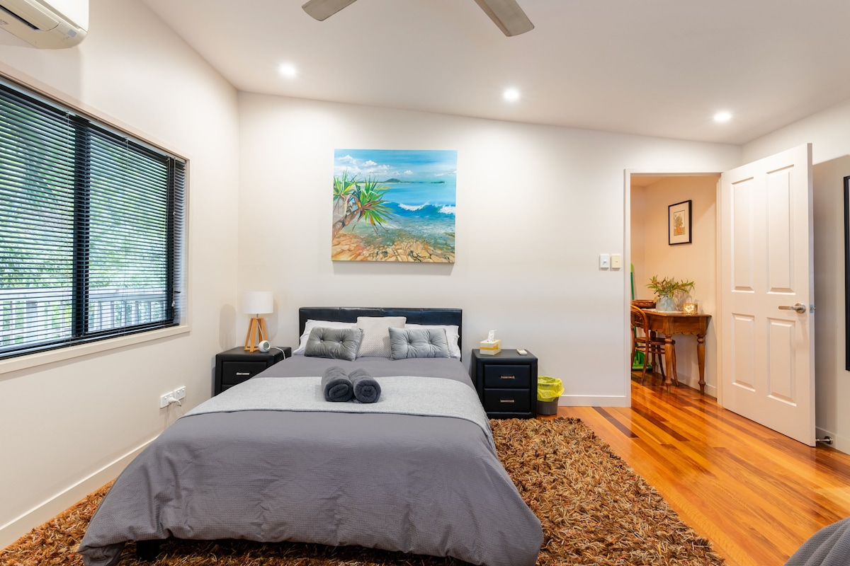 Wenn du auf der Suche nach einem gemütlichen Rückzugsort mit einem privaten Wohnzimmer, einem Queensize-Schlafzimmer, deiner eigenen Waschküche und einem Badezimmer bist, brauchst du nicht lange weitersuchen! Dieses Gästehaus liegt im Herzen der Moreton Bay, eingebettet in Buschland, wo du am frühen Morgen Wallabys beobachten kannst. Es ist nur ein 10-minütiger Spaziergang zu lokalen Geschäften, Restaurants am See, eine kurze Fahrt zu Stränden, Fähren zu lokalen Inseln und Weingütern. Die Unterkunft bietet Klimaanlage, Deckenventilator, WLAN, verfügbaren Parkplatz für einen Wohnwagen oder ein Boot, einen Pool und einen Grillplatz.