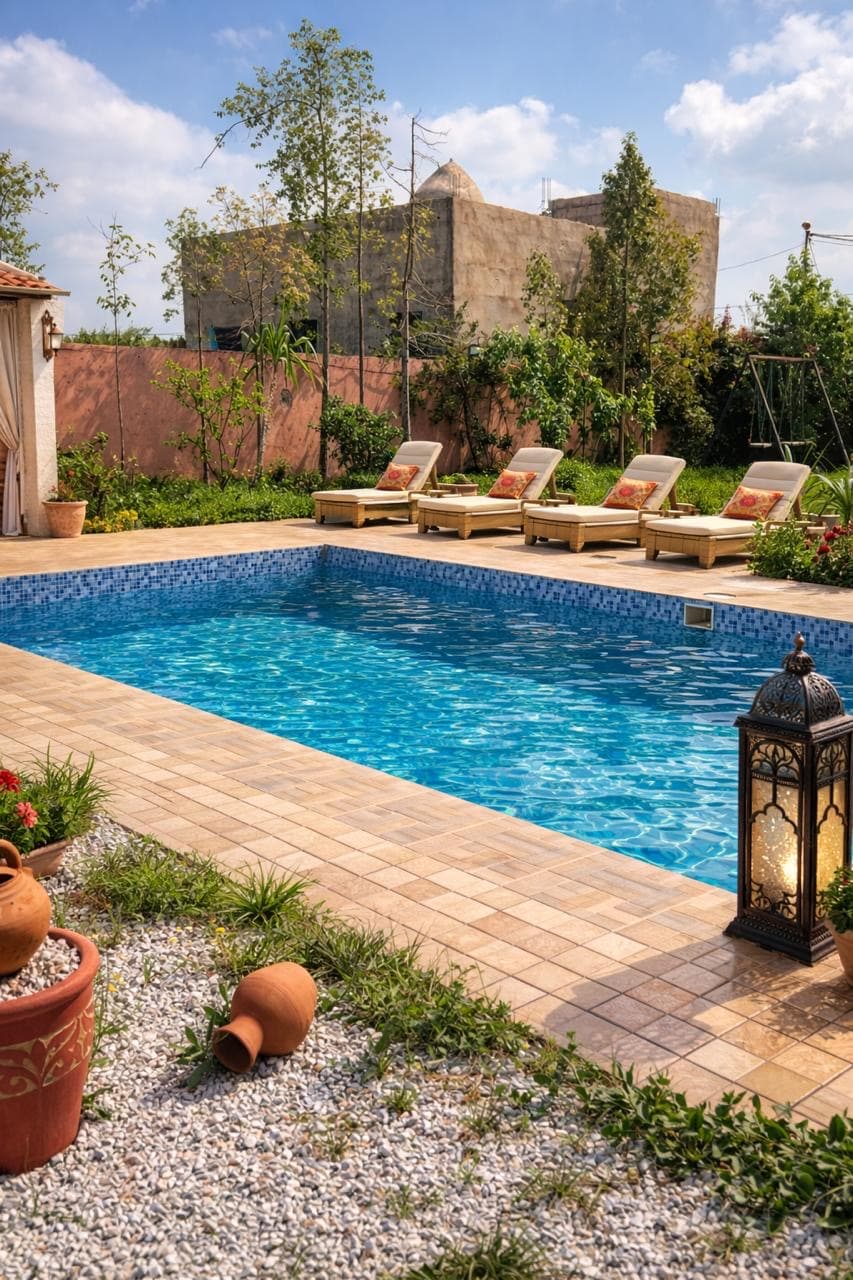 Privatisez tout l’étage de Villa Hasna et profitez de trois suites élégantes pouvant accueillir jusqu’à 6 personnes. Idéal pour familles ou groupes d’amis souhaitant séjourner ensemble tout en gardant leur intimité. Le grand jardin et la piscine de 25 m sont accessibles aux voyageurs de 10h à 18h. Nous habitons au rez-de-chaussée. Située dans un cadre calme aux portes de Marrakech, la villa offre confort, tranquillité et services sur demande (petit-déjeuner, repas, excursions, massages).