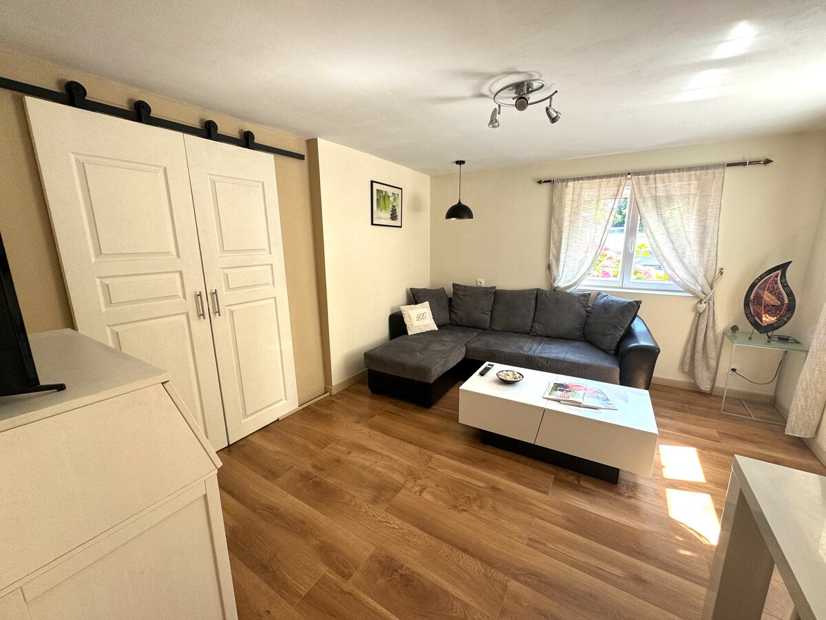 Sie können kostenlos auf dem Hof vor der Wohnung parken. Wunderschöne neue unabhängige Unterkunft, sehr ruhig, in einem Einfamilienhaus (gemeinsame Eingangshalle) - SEHR große ebenerdige Dusche, Badezimmer aus Travertin. - Ecksofa, Esstisch für 2, TV, WLAN, Netflix (Ihre Codes), Chromecast, Büroecke. - Voll ausgestattete Küche. - Schlafzimmer mit Standard-Doppelbett, großes Ankleidezimmer. - Waschmaschine Im Sommer entspannende Zen-Terrasse, Pergola, Hängematte, Tisch usw.