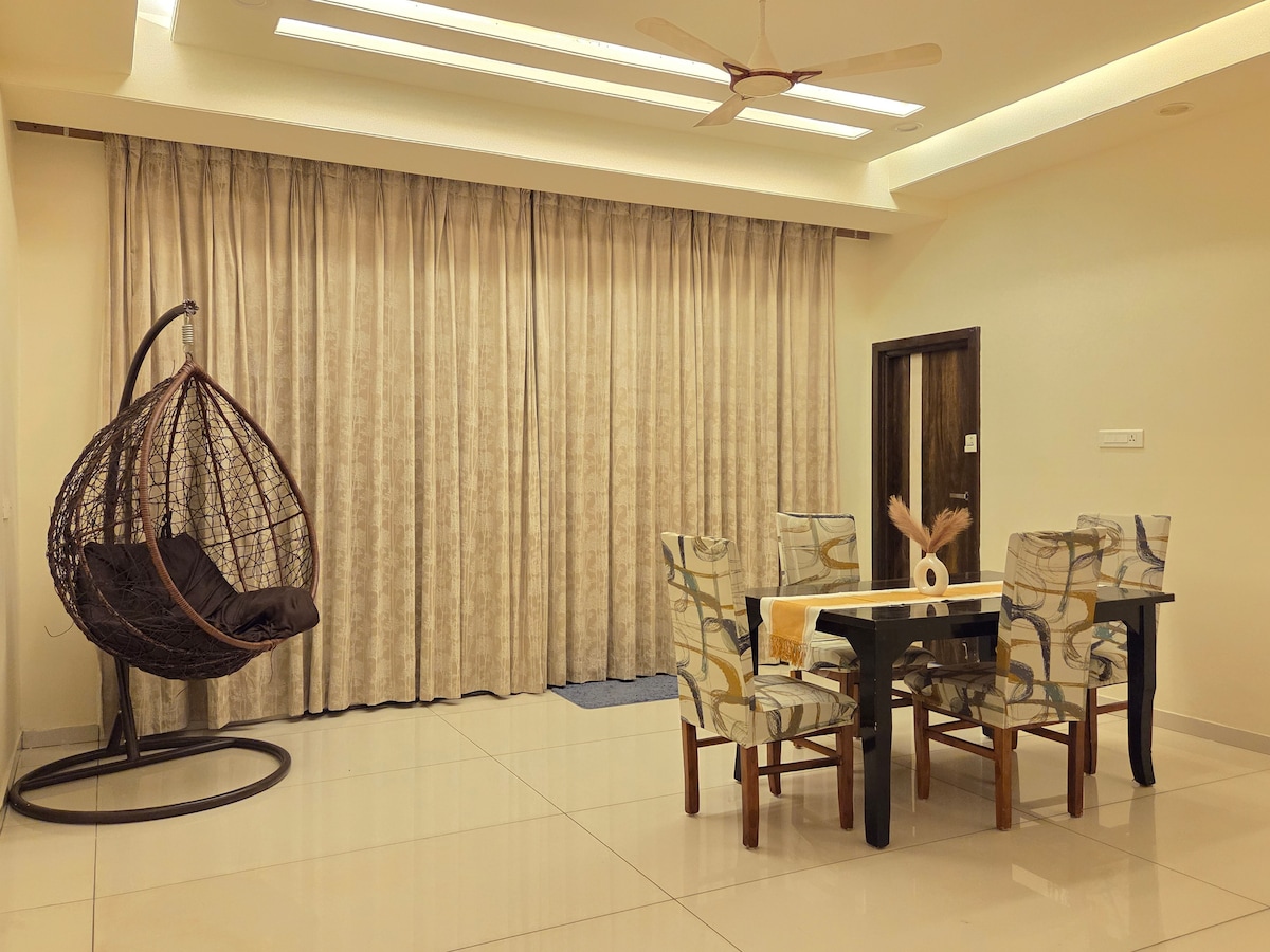 Welcome to our stylish 3 BHK apartment, ideal for short or long stays. Enjoy 3 AC bedrooms with attached baths, a cozy living room with a 43" Smart TV, high-speed Wi-Fi, and an indoor swing. The fully equipped kitchen includes a gas stove, microwave, RO purifier, fridge, and utensils. Conveniently located near Hitech City Metro, Usha Malpuri's Kitchen (100 m), US Visa Center (1 km), Cable Bridge, and major IT hubs..