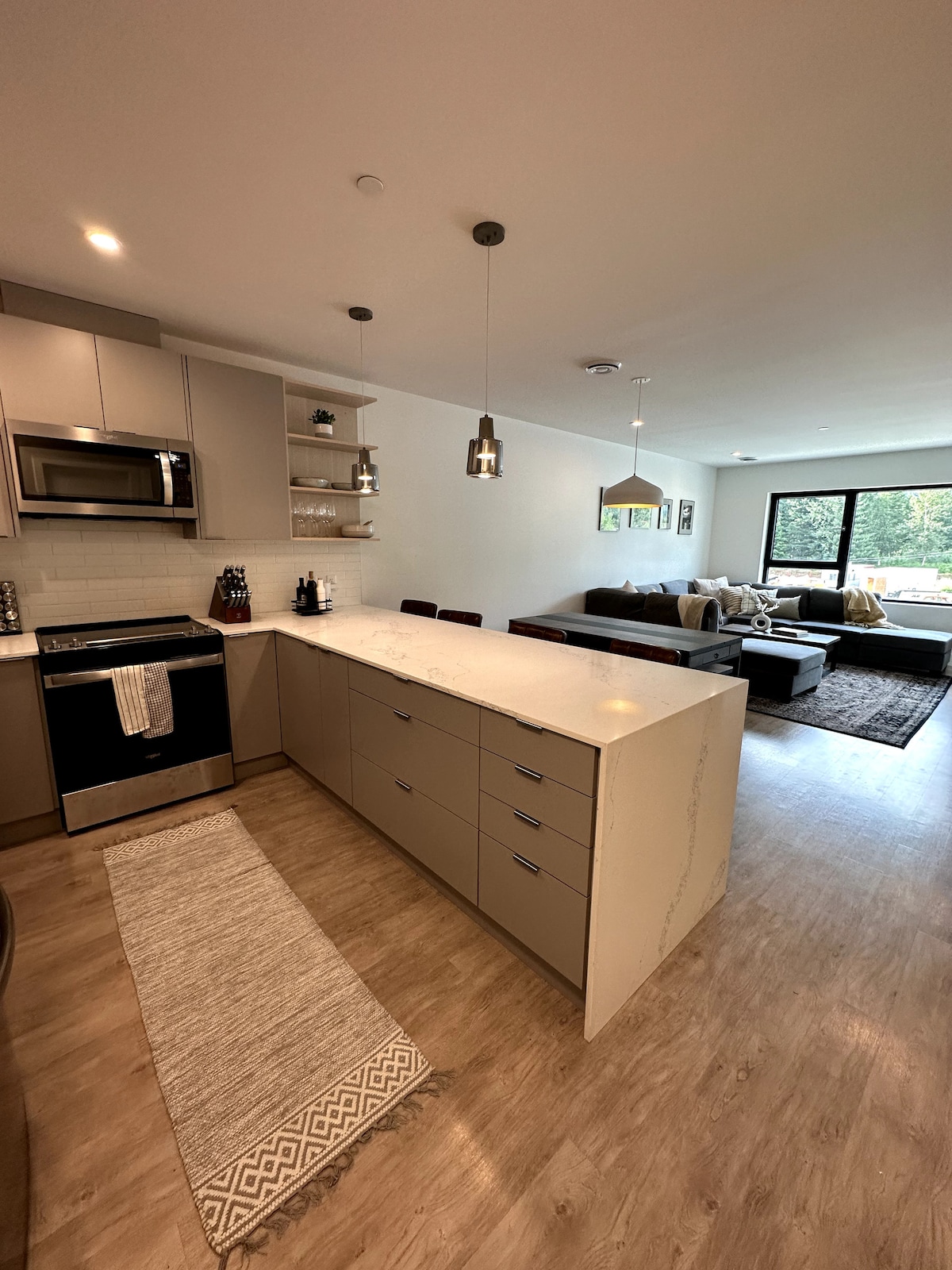 Modern 2 bedroom condo just 5 minutes to Revelstoke Mountain Resort and downtown. Set in a relaxed neighborhood within a convenient plaza, with a spa, gym, pilates studio, grocery store, liquor store, restaurant, daycare, and bakery all nearby. Enjoy a fully equipped kitchen, in suite laundry, and underground parking. Unwind on the spacious deck with mountain views, or relax indoors on the large sectional after a day of exploring. A comfortable, well located base for your stay in Revelstoke.