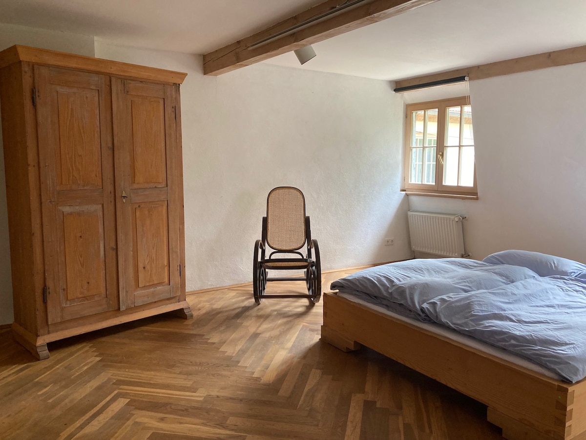 Stilvolles, helles Apartment auf historischem Gut in der Natur und doch stadtnah. Mitten im Landschaftsschutzgebiet, umgeben von Wald und Wiese, liegt das idyllische Anwesen aus dem 16. Jahrhundert. Das offene Apartment mit Galerie bietet ausreichend Platz für 4 Personen. Es verfügt über einen eigenen Eingang mit Terrasse und befindet sich im 1. Obergeschoss des Mittelbaus des Hofes. Die helle Wohnküche mit antiken Möbeln und praktischer Kochzeile lädt zum Kochen, Essen und Beisammensein ein.