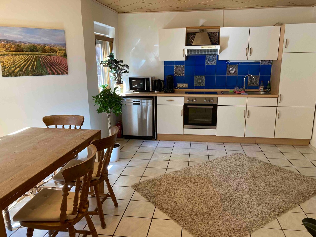 Rustikales Refugium in der Weingegend - Ihr gemütlicher Rückzugsort Willkommen in unserer charmanten Ferienwohnung , ideal für entspannte Auszeiten! Genießen Sie gemütliche Abende vor dem Kamin oder im „Heimkino“. Die rustikale Atmosphäre und die malerische Weingegend schaffen ein einzigartiges Erlebnis. Eine Besonderheit unserer mit Liebe frisch renovierten Wohnung stellt das kleine Frankfurter Bad (Duschhöhe = 2,10 m) dar. Entspannen und genießen Sie Ihren Aufenthalt !