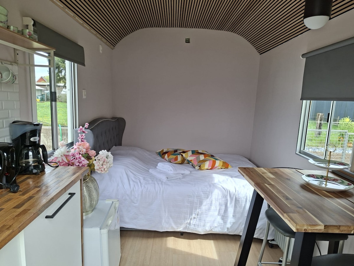 Inmitten der Obstbäume auf unserem Grundstück in unverbauter Natur befindet sich die Übernachtungsmöglichkeit FreiLAND-Häusle. Ein ehemaliger Bauwagen wurden zu einer wunderschönen Übernachtungs- und Erholungsoase umgebaut. Er bietet Platz für zwei Personen. Die modernen Sanitäranlagen sind in ca. 20 m Entfernung unter gebracht. Eine Außensitzgelegenheit und der Grillplatz sind direkt vor der Tür. Durch das große Panoramafenster vorm Bett, fühlt man sich inmitten der Natur.