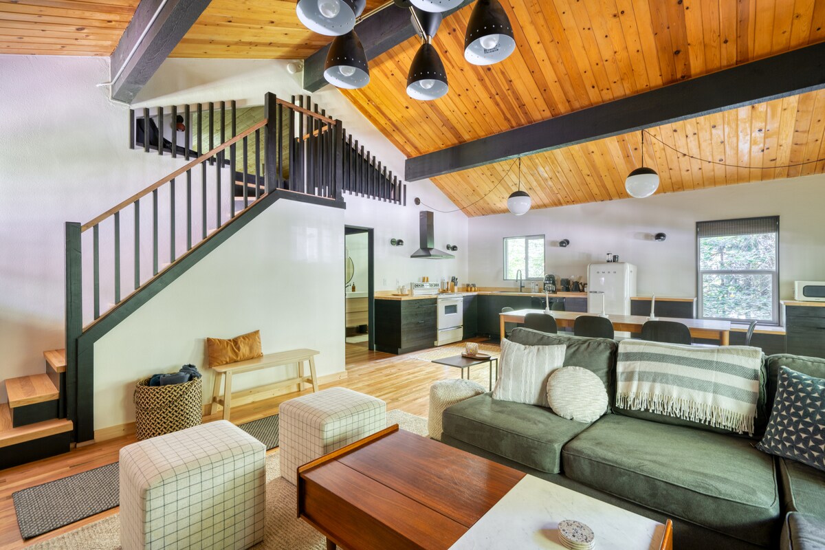 Welcome to Rhodi House — a peaceful, design-forward cabin tucked near Mt. Hood National Forest. 15 minutes from Government Camp and walking distance to the Sandy River, this renovated 1970s retreat offers two king bedrooms, a cozy open loft with a double hide-a-bed, a wrap-around deck, and a private hot tub nestled in the trees. With modern style, a stocked kitchen, and soft linens, it’s the perfect year-round escape for couples, friends, or families.