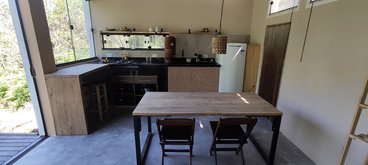 Nossas Suítes são inspiradas nas Tiny Houses, construção cuja filosofia é embasada no minimalismo, criando espaços práticos e eficientes em espaços reduzidos. Construída em adobe e madeira, alia conforto e funcionalidade em um ambiente rústico. Essa suíte possui mini cozinha completa, cama beliche, mesa de trabalho, cabideiro, ventilador e rede. O nosso terreno possui ainda uma mesa de refeições ao ar livre, rede de balanço, área de serviço, ducha externa e fonte de água mineral