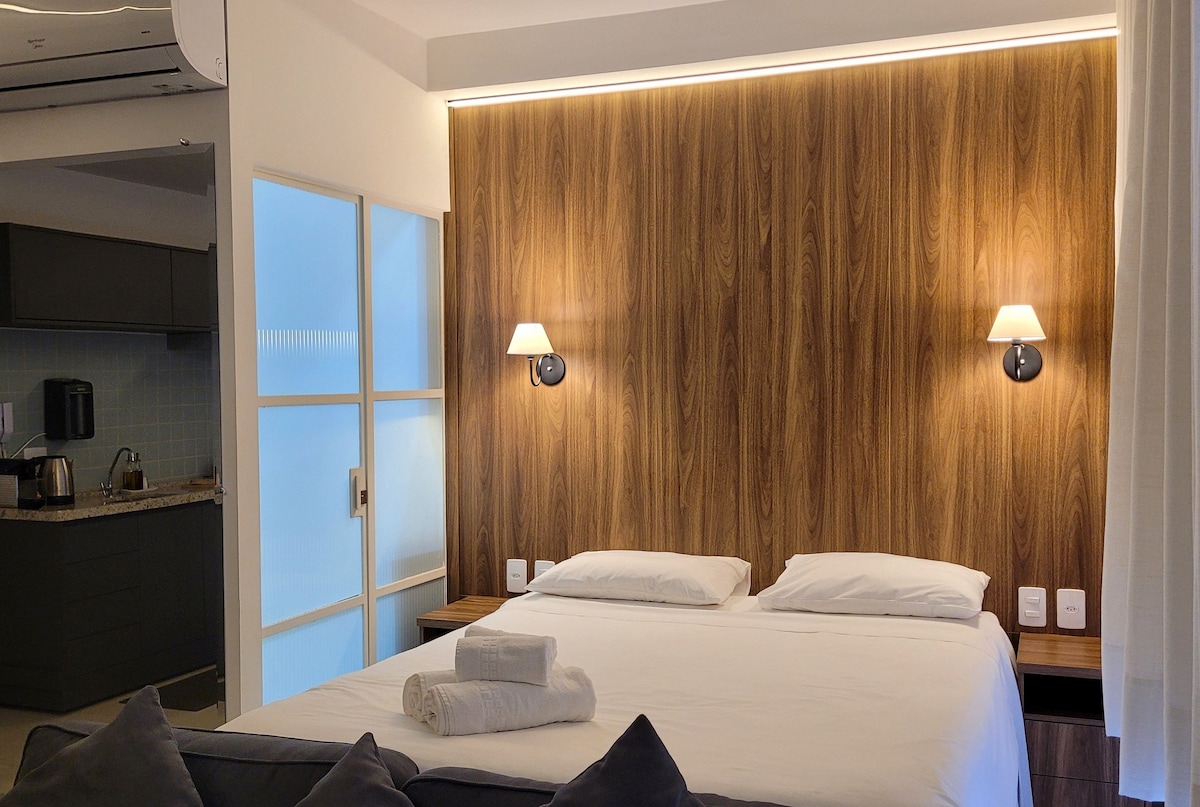Entspannen Sie sich an diesem einzigartigen und ruhigen Ort. Komplettes Studio mit WLAN, Smart-TV, Klimaanlage, Alexa, Küchenutensilien, Kaffeemaschine, Wasserfilter, Haartrockner, Bügeleisen und allem, was Sie für Ihren Komfort benötigen. Sie können zwischen 2 Einzelbetten oder 1 Queensize-Bett wählen. Genießen Sie die Gemeinschaftsbereiche wie Pool, Aufzug, Parkplatz, Wäscherei, 24-Stunden-Rezeption, Raum für Studien oder Tagungen und Gourmetbereich. Ausgezeichnete Lage, in der Nähe des Krankenhauses São Francisco und der Fakultät UNAERP.
