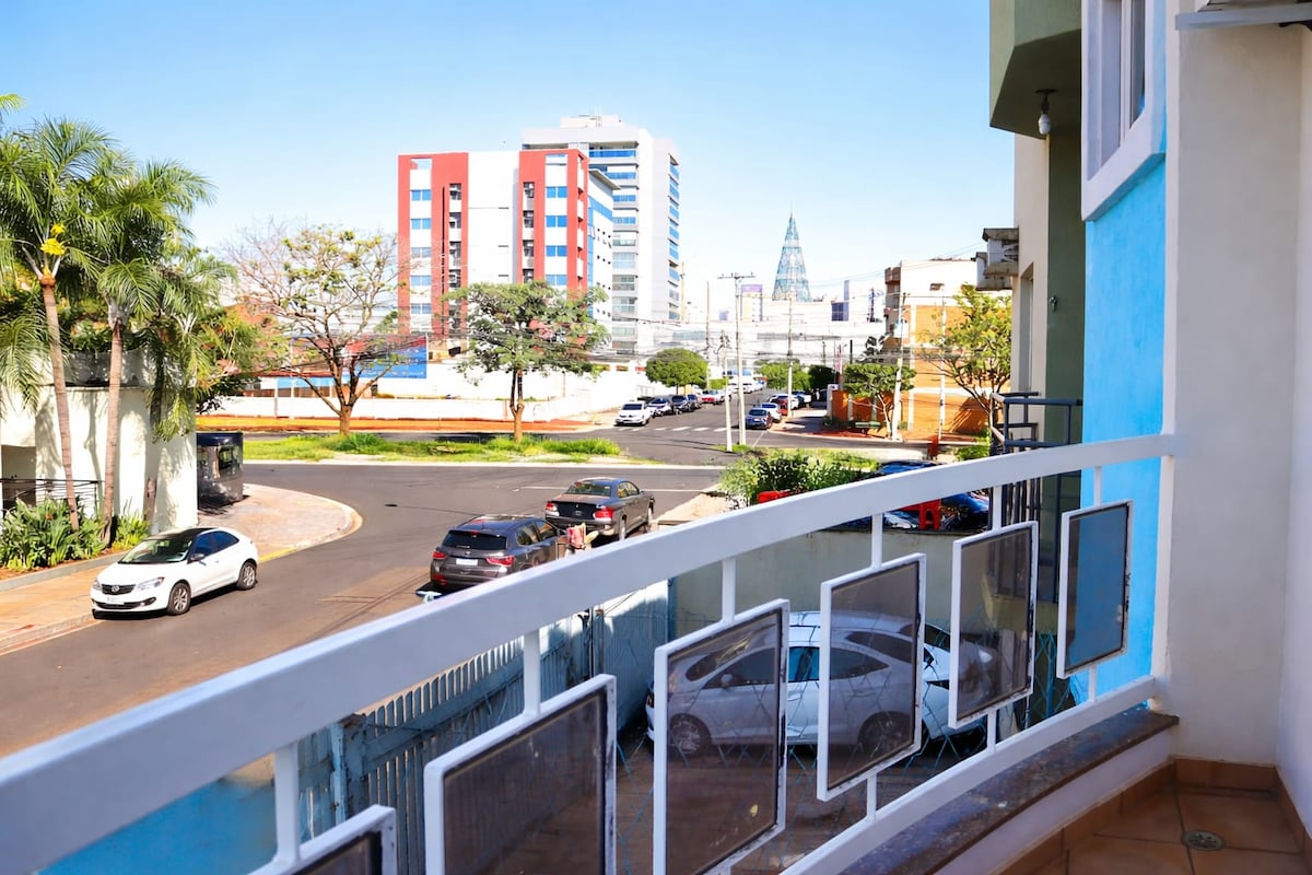 Flat mobiliado no Centro, localizado no 12º andar, com conforto, praticidade e excelente localização. Com 1 quarto contendo uma cama de casal, 1 banheiro, sala integrada à cozinha americana equipada, varanda com vista da cidade, ar-condicionado na sala e no quarto, TV e Wi-Fi. Com infraestrutura de hotel, piscina, academia, portaria 24h, elevadores e 1 vaga de garagem com serviço de manobrista. Localização privilegiada: a poucos minutos do Shopping Santa Úrsula, Choperia Pinguim.