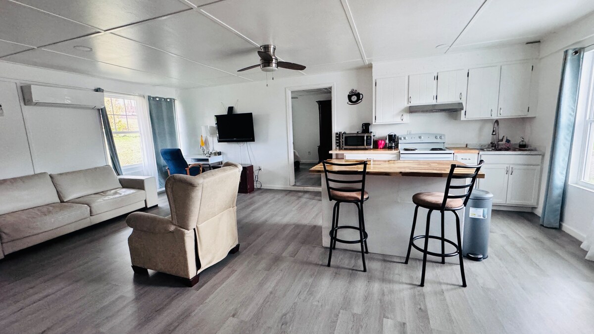 Enjoy a comfortable and peaceful stay in this bright and spacious private suite featuring a large bedroom, private bathroom, and access to an open-concept living and kitchen area. The bedroom includes a comfortable king-size bed with soft linens, nightstands with lamps, and plenty of space to relax. The open living space features a cozy seating area, smart TV, and a fully equipped with microwave, coffee maker, stove, refrigerator, and bar seating perfect for short or extended stays.