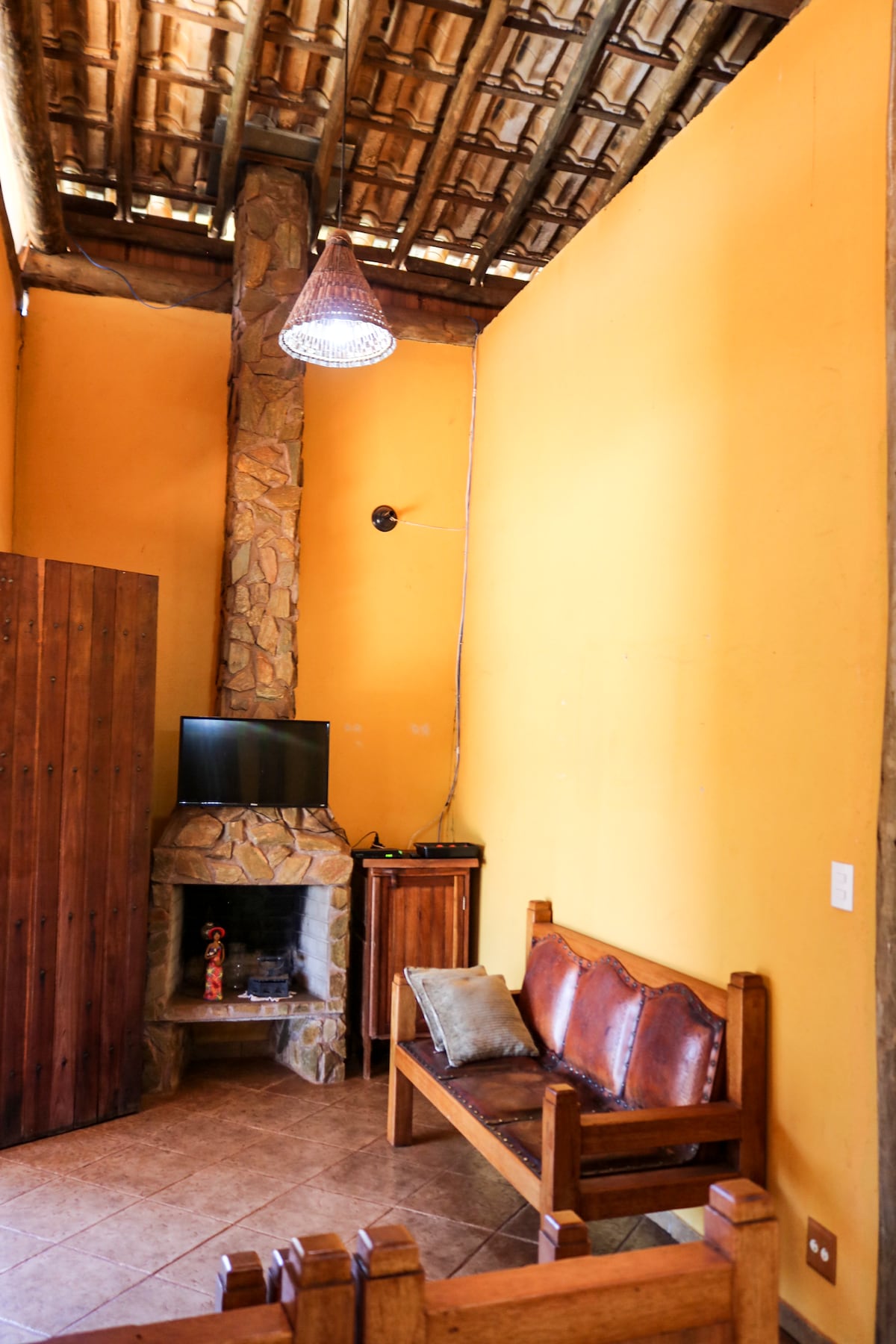 Suíte aconchegante de 20 m² no térreo, com vista para o jardim e acesso à piscina com vista. Possui cama de casal, ar-condicionado, Smart TV com streaming, Wi-Fi, mesa de trabalho e banheiro privativo com chuveiro e amenities. Roupa de cama e tomadas acessíveis garantem praticidade. Um café da manhã excepcional está incluído para começar o dia com mais sabor. Ideal para casais, família ou viajantes que buscam conforto e tranquilidade.