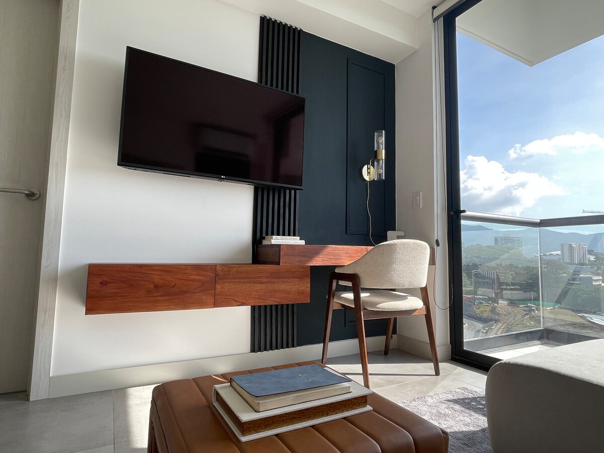 Genieße die schönste Aussicht auf die Skyline von Sabana, während die Sonne im Luxus unserer Wohnung im 16. Stock im neuesten und am besten ausgestatteten Turm von Sabana untergeht. Entspanne dich in dieser ruhigen Umgebung, wo du den Fluss und seine Vögel vom Balkon im Boho-Chic-Stil beobachten und hören kannst, während du von Natur umgeben bist, nur einen kurzen Spaziergang vom Sabana Park in San José, zehn Minuten zu Fuß von einem Lebensmittelgeschäft und 15 Minuten Fahrt vom Flughafen entfernt bist. Entdecke die Eleganz, die intelligenten Geräte und das Design unserer Wohnung.