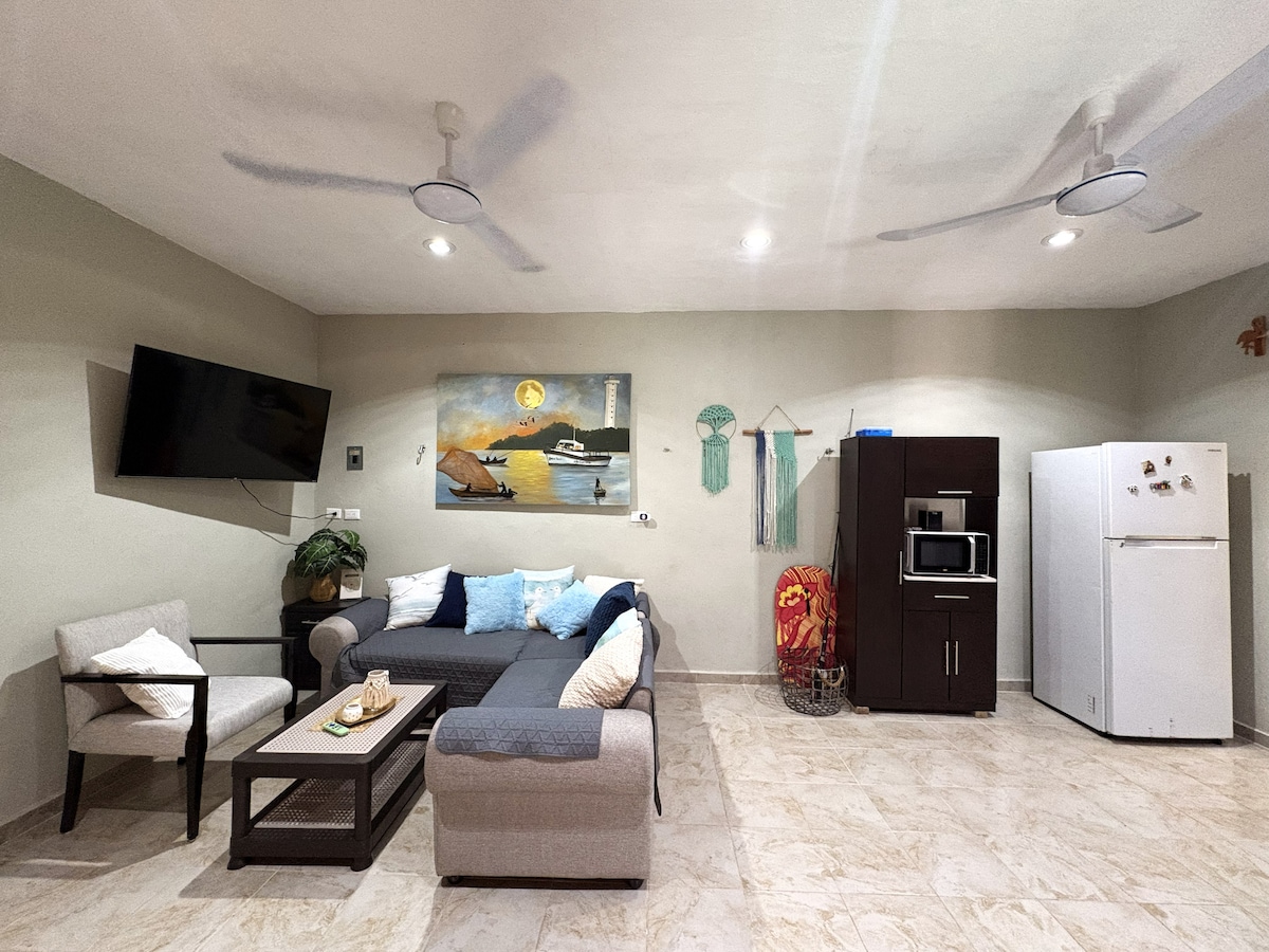 Departamento tipo estudio. Un espacio frente al mar en segunda planta,un lugarcito para relajarse y pasarse unos dias increibles, cama king size y colchon memory foam para descansar placenteramente,cocineta equipada,frigo bar,pantalla smart,wifi,tina con vista al mar, Aire acondicionado,agua caliente,sabanas,mantas y toallas. Relájate en este espacio tranquilo y elegante. *pequeña tina en el balcón con agua a temperatura ambiente *Se aceptan mascotas con costo extra. (Precio por mascota$500)