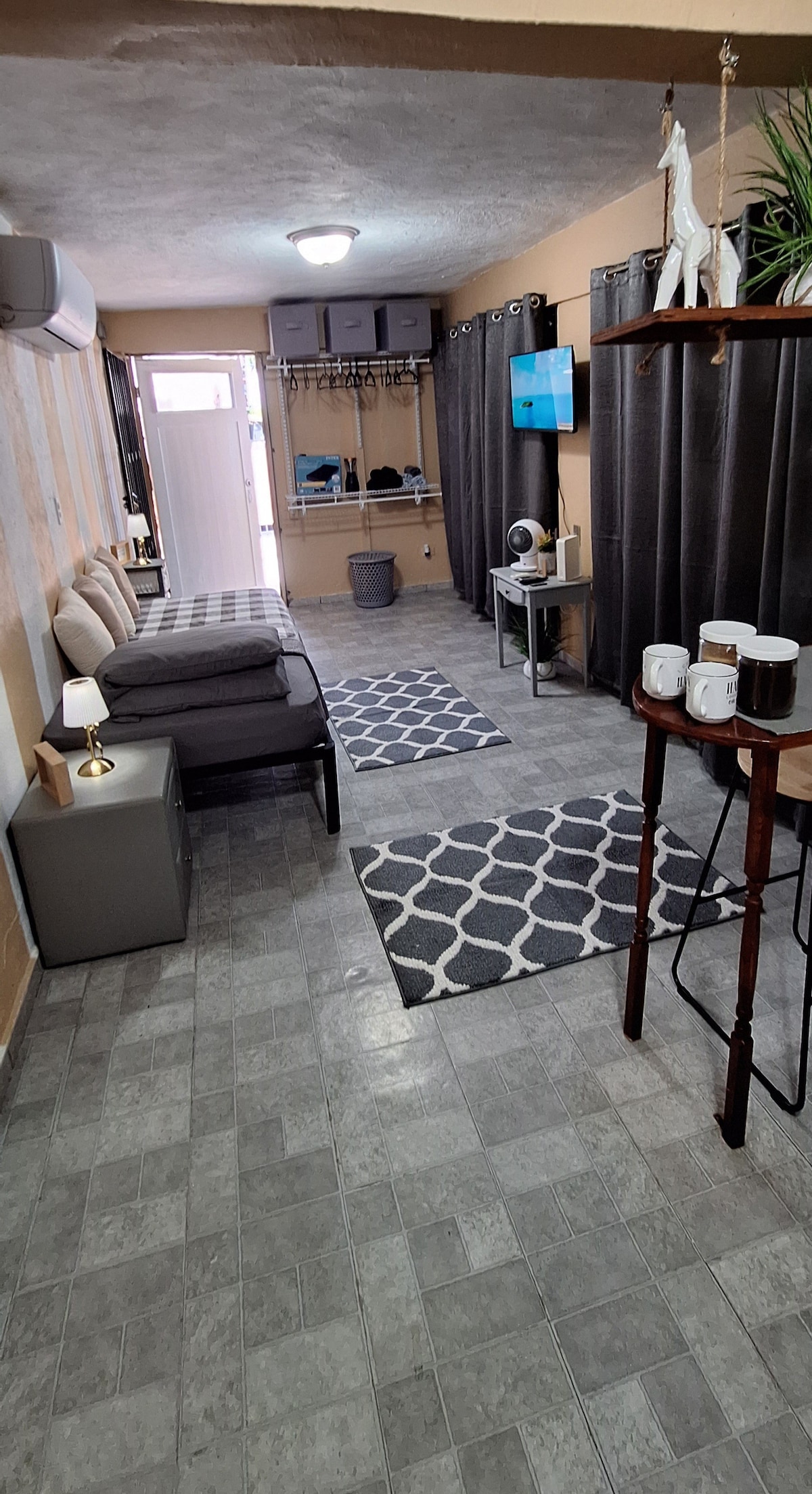 Unsere Unterkunft bietet ein wirklich tolles Erlebnis. Sehr zentrales Haus im Herzen des Stadtgebiets von San Juan. Nur 15 Minuten vom Strand entfernt mit exklusivem Zugang zum Pool für Gäste. Wir versichern dir eine einzigartige Wohnung im 3. Stock des Ateliers, die einen separaten Eingang hat, mit Annehmlichkeiten für deinen Komfort: Queensize-Bett, TV, WLAN und Klimaanlage, voll ausgestattete Küche, Esstisch, Waschmaschine und Badezimmer. Queensize-Schlafsofa und ein Balkon mit herrlichem Blick. 800 Quadratfuß Sicherheit und Ruhe garantiert.