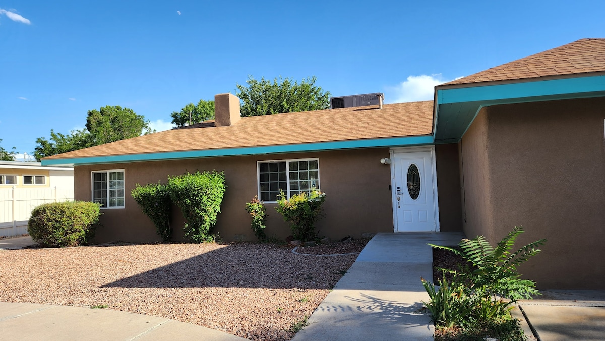 Das kürzlich renovierte Haus befindet sich in den NE Heights gegenüber einer Grundschule, fünf Minuten von der I-40 und eine 10-minütige Fahrt von der Kirtland Airforce Base entfernt. Ausgestattete Küche mit 3 möblierten Schlafzimmern und einem Büro. Großer Garten mit Grill – perfekt für Haustiere und Kinder! Das Wohnzimmer verfügt über einen 55-Zoll-Flachbildfernseher und ein Sofa und einen elektrischen Kamin. Rauchen nur draußen erlaubt, haustierfreundlich, 2 Parkplätze vor Ort, Highspeed-Internetzugang. Kein Garagenzugang.