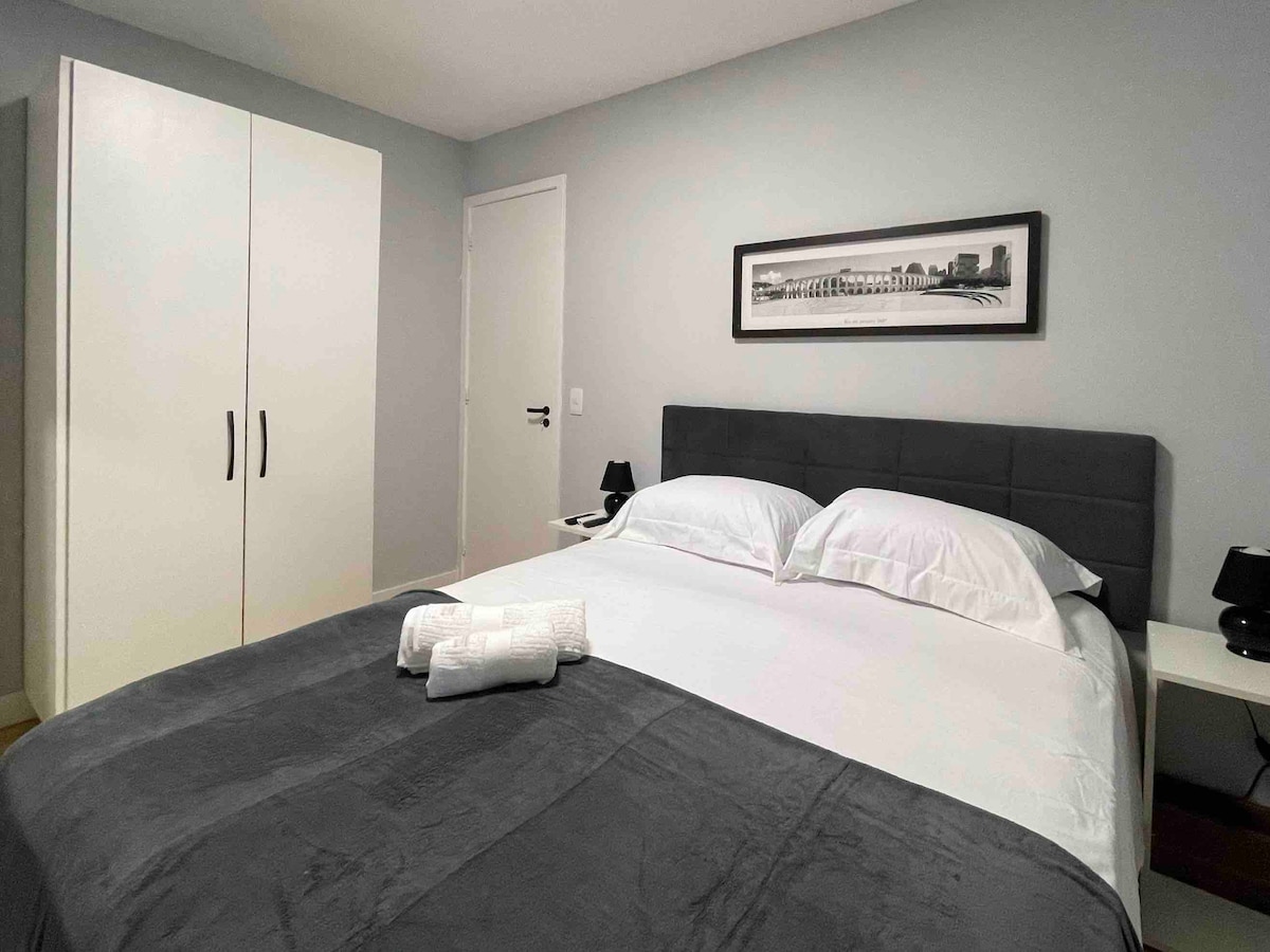 Perfekt für Ihr Home Office oder Ihre Freizeit. Super gemütliche und schöne Wohnung im Flat-Stil, mit moderner und sauberer Dekoration, perfekt für diejenigen, die ihre Arbeit oder Freizeit mit Komfort, Sicherheit, Sauberkeit und guter Lage genießen möchten. Die Sonne ist am Morgen, obere Etage, klimatisierte Umgebung. Die Wohnung befindet sich in einer geschlossenen Wohnanlage mit Sicherheitsdienst, einem Freizeitbereich mit Schwimmbad, Fitnessraum, Sauna und einem Convenience-Shop für schnelle Einkäufe. Der Raum bietet Platz für zwei Personen