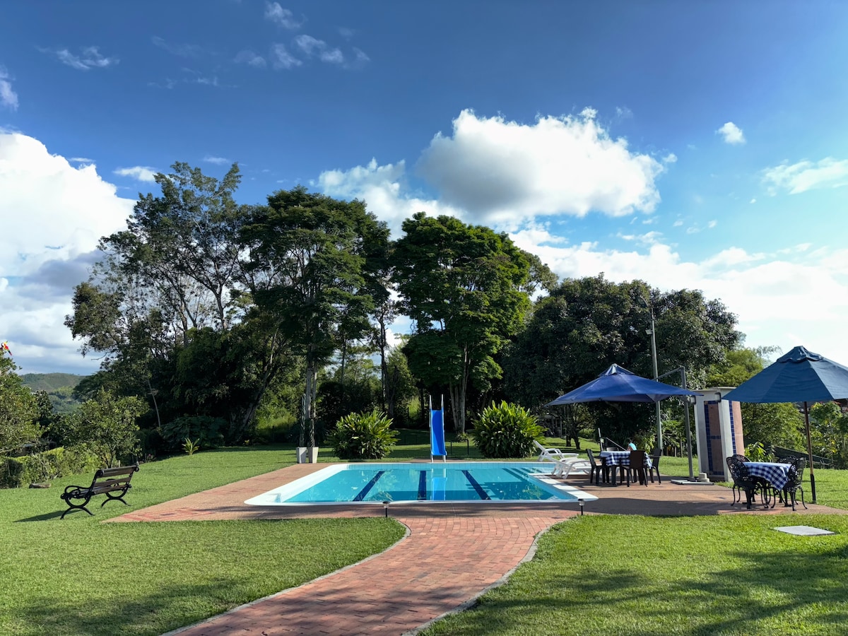 Private Villa im Herzen der kolumbianischen Kaffeeregion, perfekt für Familien und Gruppen. Genießen Sie einen privaten Pool, einen Whirlpool, einen Kiosk im Freien und zwei voll ausgestattete Küchen, eine davon im Freien Umgeben von üppigen Gärten und Bergblick, WLAN, einem Grillplatz und komfortablen Schlafzimmern. Nur 1 Stunde vom Flughafen Pereira entfernt, in der Nähe von Parque del Café, Panaca, Salento, Cocora Valley, Nevados National Park, Santa Rosa Hot Springs. Voll ausgestattet, mit einem optionalen lokalen Koch für Mahlzeiten gegen Aufpreis. Ihr perfekter Kurzurlaub