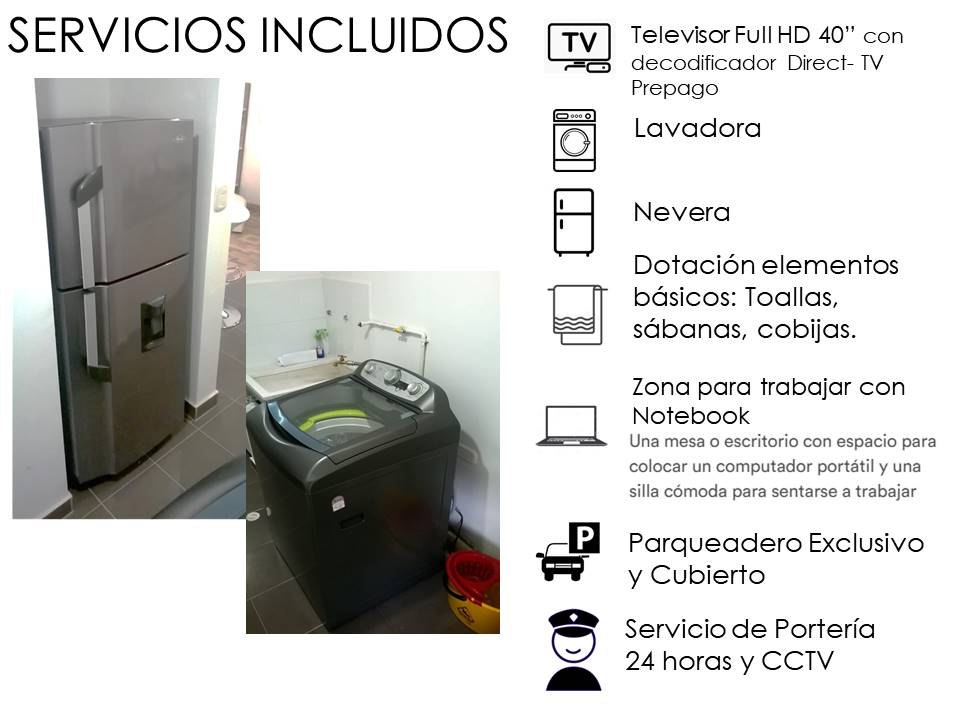Wohnung in Pinares de Cataluña: - Alle Dienstleistungen inklusive (Wasser, Strom, Gas, WLAN, TV). - Überdachter Parkplatz (für Kleintransporter). - Voll möbliert. - 1 Schlafzimmer mit Kingsize-Bett. - Großes Sofa und Arbeitsbereich. - 1 komplettes Badezimmer (mit Warmwasser, wenn gewünscht). - Küche mit allem, was man braucht. - Waschmaschine und alles, was man für Bad und Schlafzimmer braucht. - Bettwäsche und Handtücher. - Lage: bester Sektor von Pereira, Pinares Es ist ruhig, sehr zentral, sichere Gegend und 24 Stunden Überwachung.