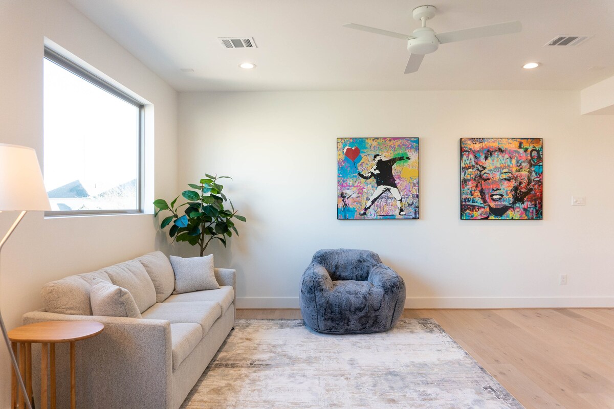 Erlebe einen lebendigen Kurzurlaub in Houston mit diesem schicken Duplex-Haus, das ein stilvolles monochromes Interieur mit farbenfrohen Kunstwerken bietet. Genieße deine eigene Hinterveranda und einen Grillpavillon in einem üppigen Garten. Nur 5 Minuten von Annehmlichkeiten wie Whole Foods und Buffalo Bayou entfernt und eingebettet in die trendige Gegend von Lower Montrose erwartet dich dein städtischer Rückzugsort. Mit 2 Queensize-Betten, einem gemütlichen Wohnraum und Houstons besten Attraktionen vor der Haustür, mach dich bereit für einen unvergesslichen Aufenthalt. Buche jetzt für dein perfektes HTX-Erlebnis!