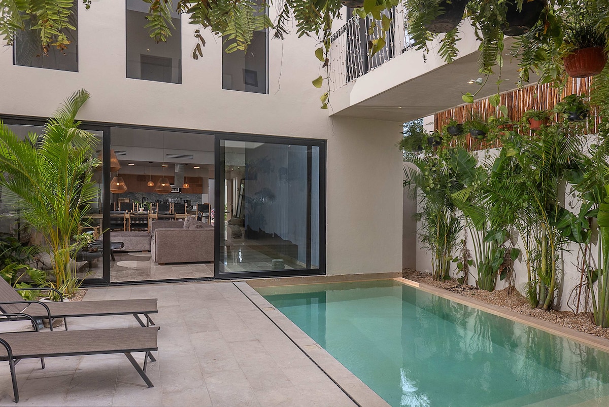 Buena Casa is the ideal hideaway for groups seeking to unwind in a lush jungle setting, in a quiet residential neighborhood with security guard, steps from La Veleta and with easy access to the beach and downtown. This boutique villa for up to 8 guests offers spacious interiors, 3 ensuite bedrooms, a private pool with waterfall, tropical gardens, and a rooftop with BBQ. Includes daily housekeeping, house sitter, and concierge. American breakfast available at extra cost.