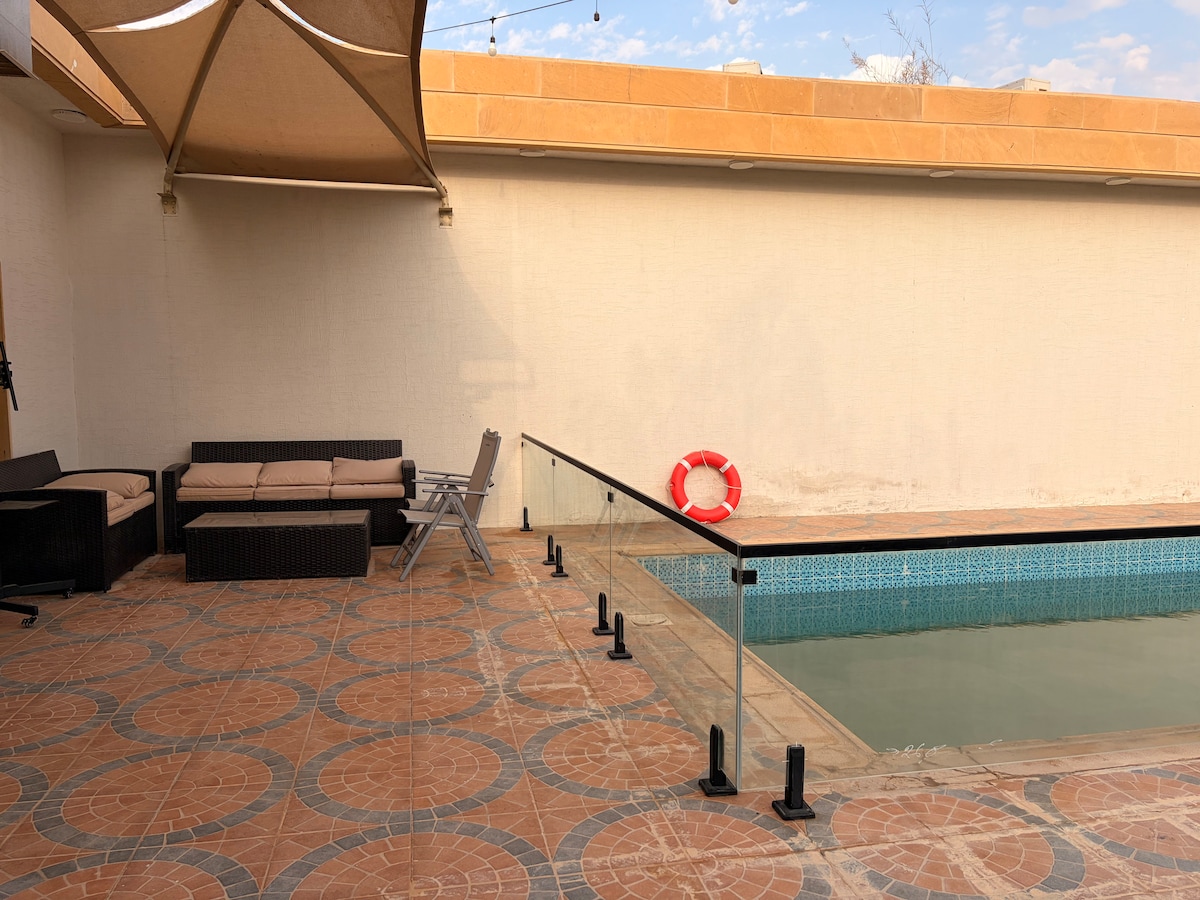 Das Chalet im al-Ray 'ah-Viertel in der Nähe des King Fahd Cultural Center ist Teil einer Villa und verfügt über eine Lounge im (Keller) für 15 Personen mit einem Schlafzimmer , eine Esszimmer für 10 Personen und ein Badezimmer sowie ein Außenzubehör mit 12-Personen-Einrichtungen und Grünflächen-Sitzungen mit Koch- und Grillmöglichkeiten, ein Wassersprühsystem für die Luft und einen wasserdichten Pool, Innenparkplätze mit maximal zwei Autos(das Schlafzimmer mit zwei Einzelbetten, 4 Bodenbetten können bereitgestellt werden, breite Bettfischwolle kann verwendet werden)