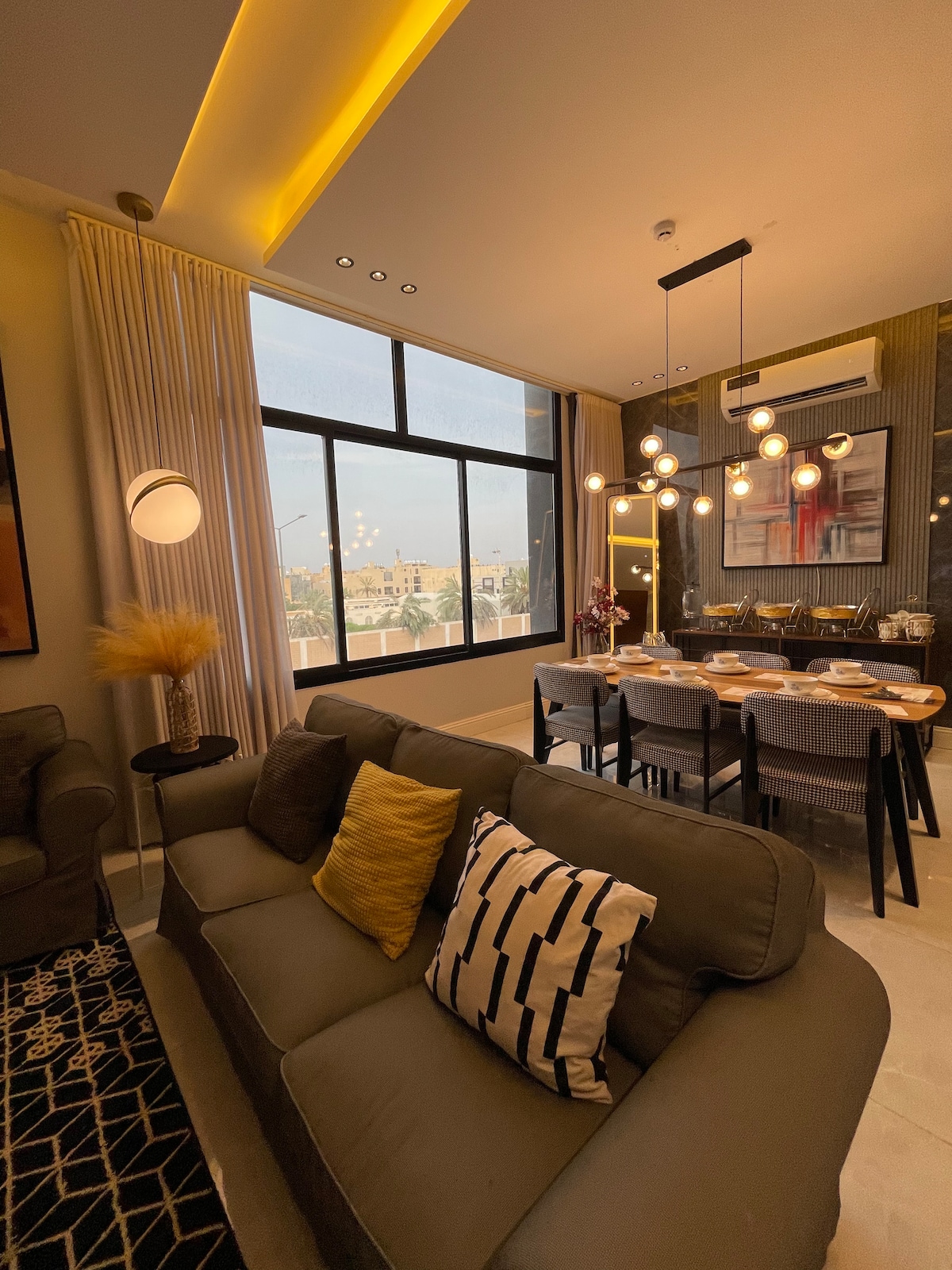 Modern 1BR in Hittin, one of Riyadh’s prime locations, minutes from Boulevard City and top cafes. Designed for comfort and ease with self check-in and a full smart system. Features a cozy living area, comfortable bedroom, 85” Smart TV, and an elegant electric fireplace for a relaxing atmosphere. Fully equipped kitchen with oven, microwave, electric stove, dishwasher, and washing machine. Clean, stylish, and ideal for couples, business travelers, and short or extended stays.