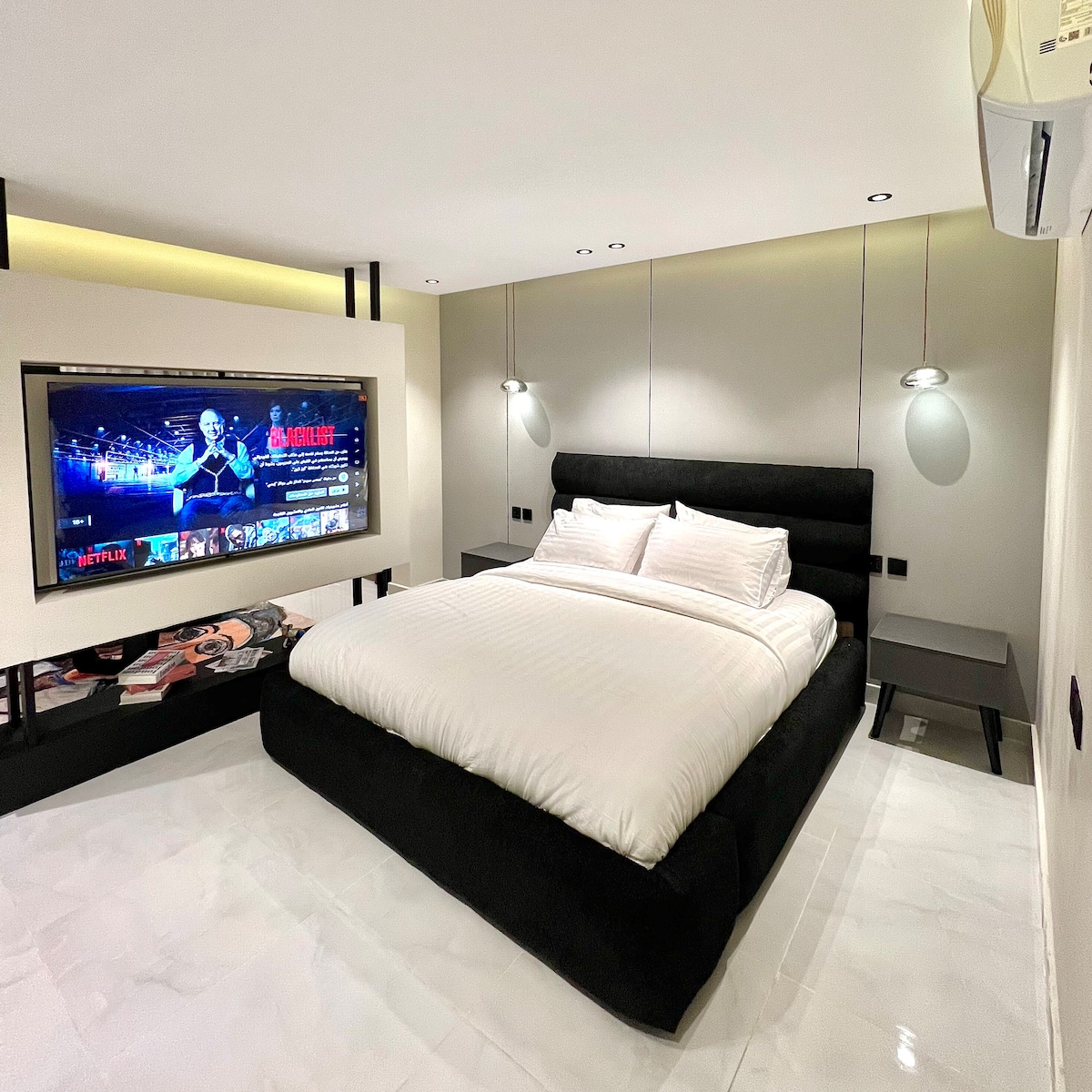 High luxury apartment with: 1- BBQ 2- Outdoor jacuzzi 3- private entrance + self entry 4- waterfall 5- garden 6-projector 7- coffee machine+popcorn maker 8- Kitchen with equipment 9- Hotel Robes, towels and slippers 10- Bose sound sys in all home شقة مودرن عصرية للاستجمام وراحة البال 1- شواية 2- ساوند سيستم كامل بالشقة 3- جاكوزي خارجي 4- مدخل خاص 5- شلال 6- حديقة 7- بروجكتر خارجي 8- قهوة ( بلاك + كبسولات ) + آلةالفشار 9- مطبخ بكامل التجهيزات 10- ارواب و سليبرات فندقية