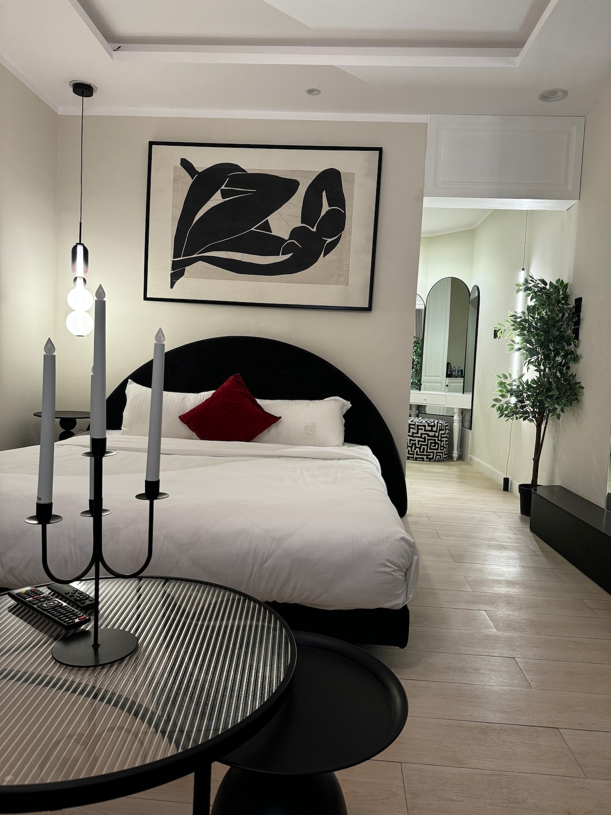 Cozy and luxurious apartment designed by Architect Khaled, located near Boulevard and close to the Financial Center (KAFD). Features a simulated fireplace that adds a warm and inviting ambiance. Includes a bedroom with a comfortable seating area, a stylish dressing room with a uniquely designed makeup vanity, and a spacious wardrobe. The apartment boasts a sophisticated and comfortable design, perfect for modern living.