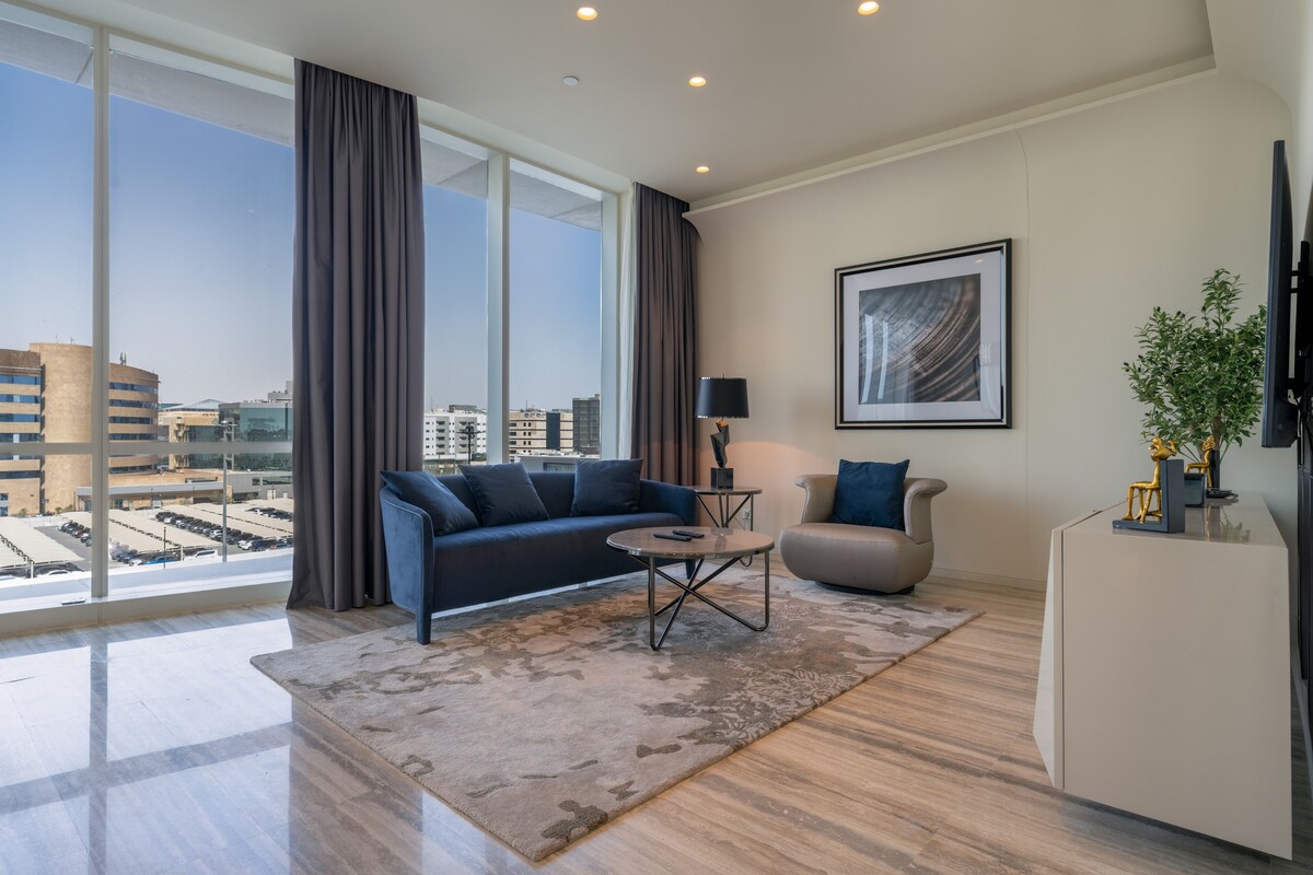 Apartment in Burj Rafal (owner's residence), 50+ floors, a northern view, for those looking for quiet and distinguished accommodation, near the most prominent landmarks of Riyadh. Fully equipped, designed and furnished with luxurious personal furniture; includes a bedroom with a master bed, a kitchen, (2) bathrooms. cinematic lighting, a washing machine, coffee machine, a 75-inch TV & large screen in the bedroom, air purifier filter, Kitchen tools to spend a period of stay in complete comfort.
