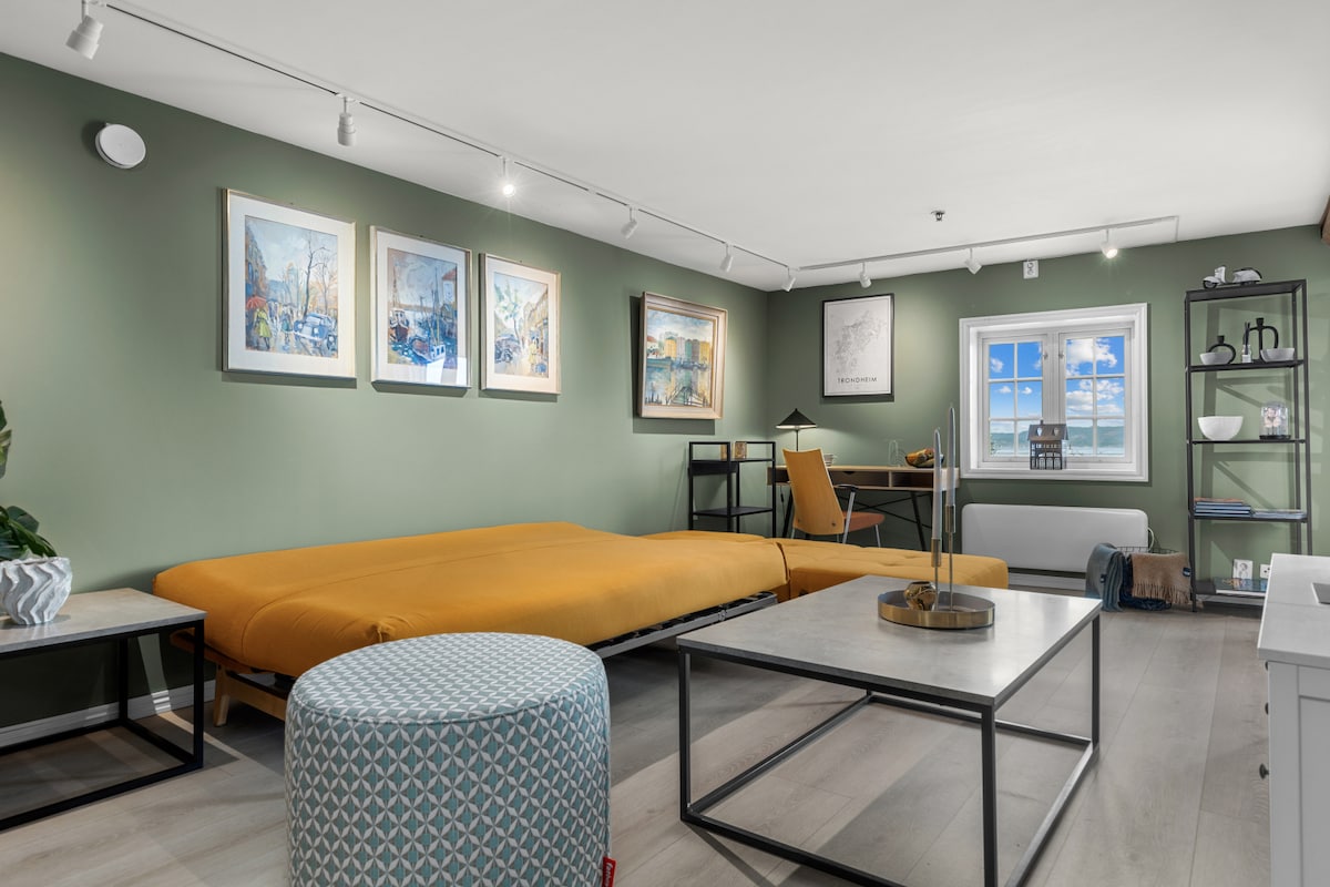 Erlebe eine einzigartige und luftige Wohnung, die zentral gelegen ist. Blick auf das schöne Nidelven, mitten im Herzen von Trondheim und mit ALLEM, WAS die Stadt zu bieten hat, nur wenige Gehminuten entfernt. Einfacher Zugang vom Flughafen Værnes mit Bahnhof Trondheim und Bushaltestelle um die Ecke. Die Wohnung ist 65 m2 groß und verfügt über ein luftiges Schlafhaus von 19 m ² mit einem Doppelbett, einer praktischen Kleiderschranklösung und einem Schreibtisch. Darüber hinaus kann das große Sofa im Sitzbereich leicht zu einem Doppelbett umfunktioniert werden. Gut ausgestattete Küche mit großem Esstisch