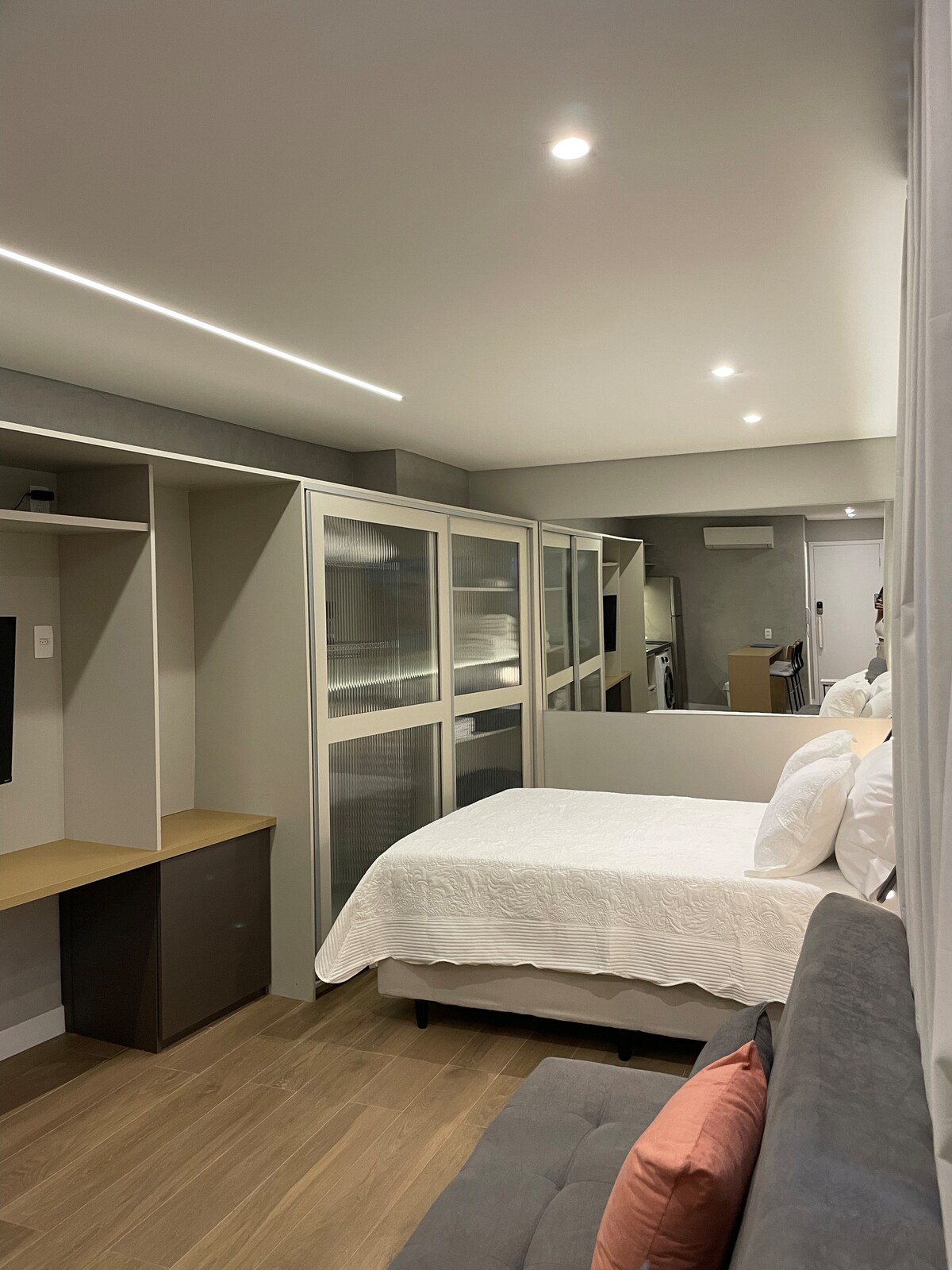 Charmantes Studio mit Terrasse und Außenküche, im Herzen von Brooklin, in der Nähe der Avenida Engenheiro Luís Carlos Berrini und des Flughafens von Congonhas, nur 7 Minuten zu Fuß von der U-Bahn-Station Campo Belo entfernt. Highlights: - Geräumiges Zimmer mit Queensize-Bett - High-Speed-WLAN-Internet - Arbeitsbereich (Schreibtisch und Bürostuhl) - Privater und überdachter Innenhof - Private und überdachte Außenküche - 40-Zoll-Smart-TV