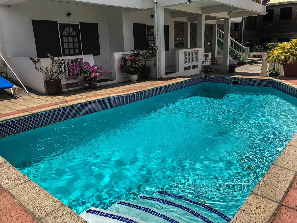 This is a very inviting, fully furnished one bedroom apartment. Downstairs, living/dining area, kitchenette, laundry room, store room, balcony leading on to the semi-private swimming pool. There is magnificent view of the ‘seven hills of Marisule’ and part of the Marisule beach. Upstairs is a spacious bedroom with an en-suite bathroom. There is a large car park which is gated.