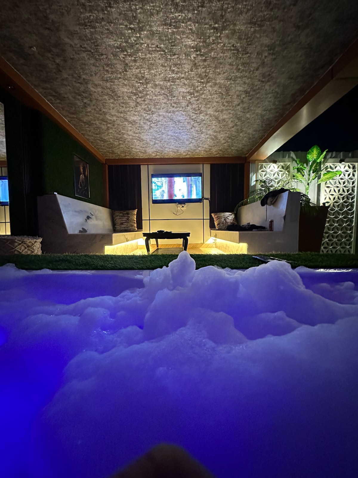 Mind Expanding Space, a Secret Hide-Out Bedroom w/ Jacuzzi cum Pool - located in the Heart of South Delhi-Gk1 (LaneNo.1, N-57-Gk1) is a 1BHK Bedroom Suite with attached toilet, overlooking a large Jacuzzi, a Sun Lounger deck for sunbathing with outdoor shower. There is a Outdoor Kitchen with Dining area, Weber BBQ, herb gardens and a lawn with a Daybed and Swing. Equipped with SwimSpa Pool 16'x8' ft, surrounded by grass walls for full privacy. Total area:1100Sqft