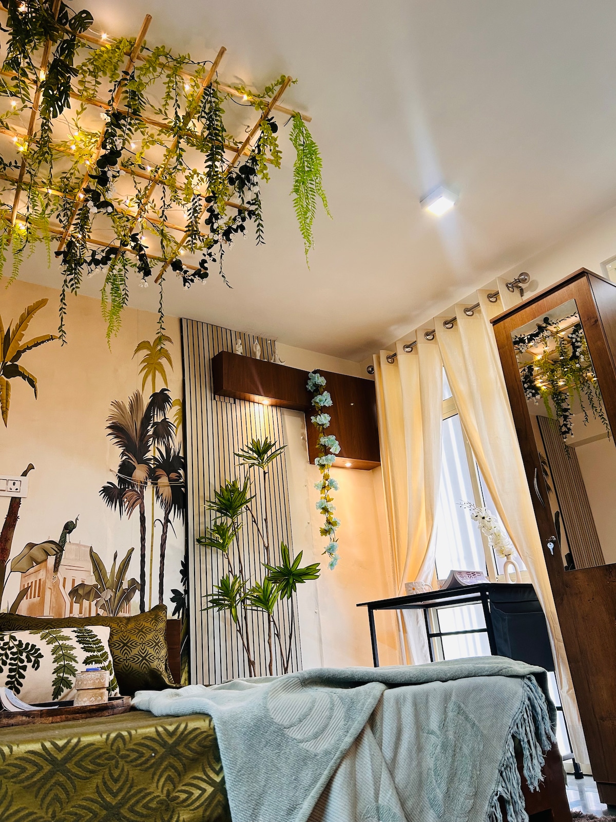 Boho-luxury 1BHK with a warm, cozy vibe featuring a private balcony with cushioned swing and fairy lights. ✨ Enjoy a 55” Smart TV with soundbar and subwoofer for a theatre-like experience. The stay offers AC, air purifier, induction, fridge, RO, cookware and tea/coffee. 🙌🏻 Located near Shalimar Bagh Metro, just 100m from KFC, Domino’s and McDonald’s, and close to PVR and Pacific Mall. 📍 Ideal for dates or birthdays, with décor available on request.❤️