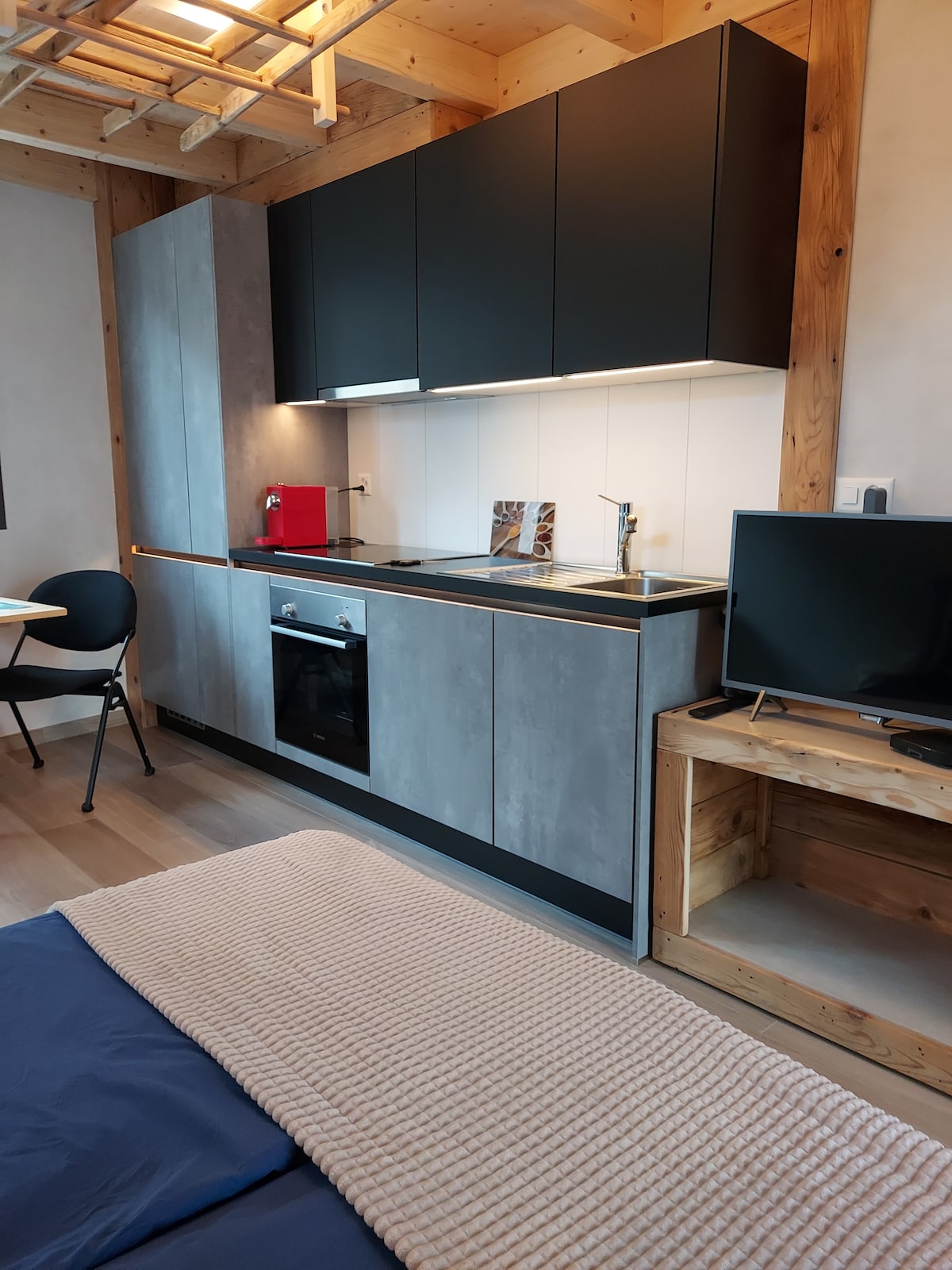 En Suisse, dans le petit village de Leysin, canton de Vaud, appartement-studio au rez-de-chaussée d'un chalet, 2 pièces 40m2 avec wifi, séjour-salon, salle de bain avec douche, coin canapé-lit, cuisine équipée avec induction et table-billard. Entrée indépendante, terrasse 15 m2 avec vue sur la plaine du Rhône et Dents du Midi, une place parking devant le chalet . Situé à 1300m d'altitude, à 300 mètres de la gare et du bus navette pour rejoindre pistes de ski et départ de randonnées.