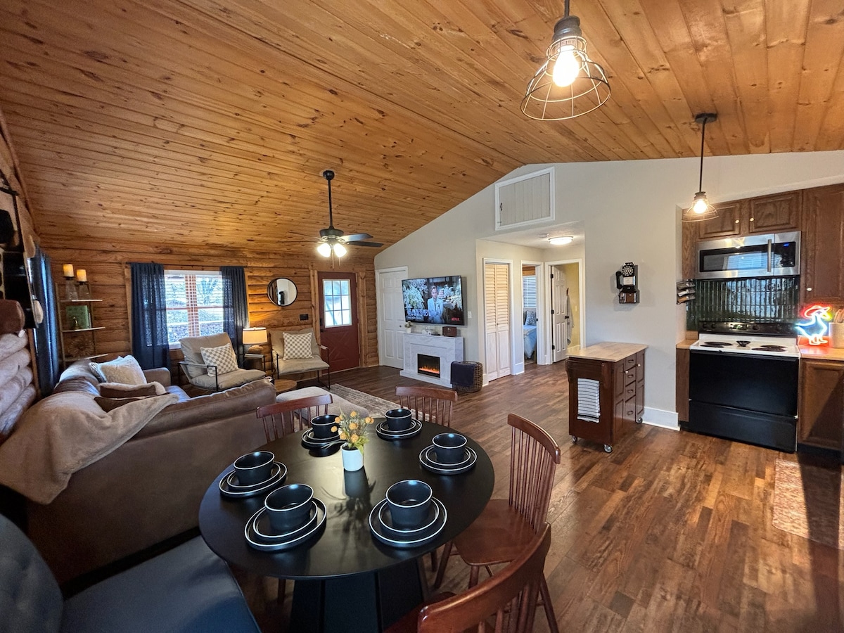 The Little Black Cabin is everything you've been dreaming about for your cozy mountain getaway! Take in sweeping views, curl up by the fireplace, or make s'mores at the fire pit. Whip up a gourmet meal in the small but well-appointed kitchen. Three dining areas offer options for dinner -- or a remote office, thanks to wifi. Sample nearby hiking, yoga, and farmers' market. We're a little rustic (no TV, AC, microwave, laundry or dishwasher) and a lot stylish!