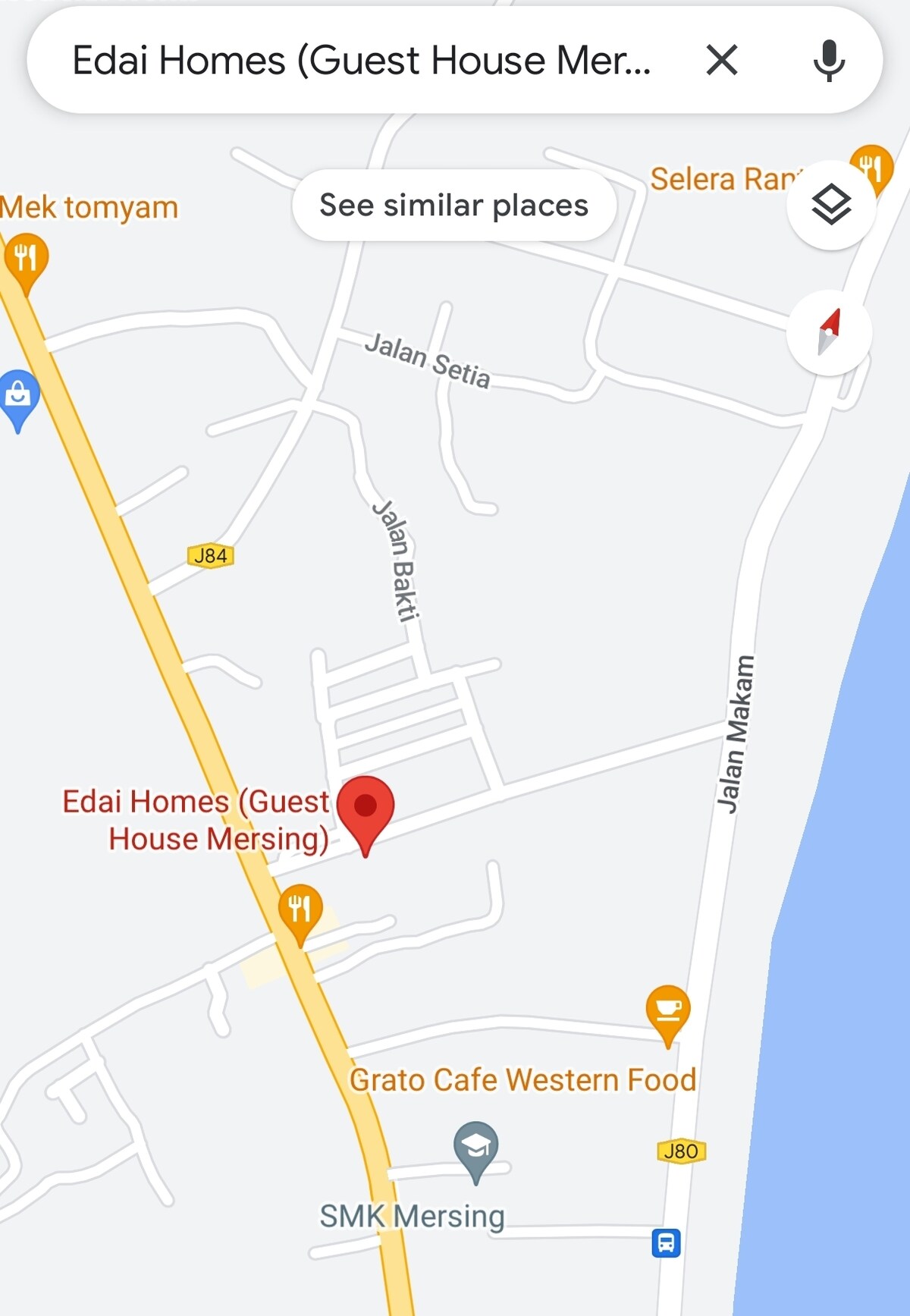 Eigenes Haus 3 Schlafzimmer 2 Queensize-Betten 4 Einzelbetten 8 Personen 2 Badezimmer 1 km zum Mersing-Steg und Strand 900 m zum Bus- und Taxiterminal 800 m zur Innenstadt 200 m-500 m zum Spielplatz,Frühstücksladen,Obstladen, 7-11, Fischrestaurants,Buchladen usw.