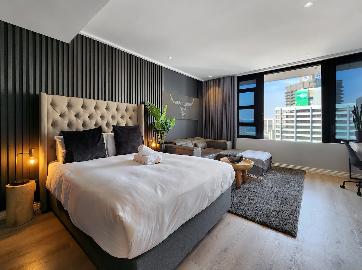Wir heißen dich herzlich willkommen in unserer brandneuen, modernen und geschmackvoll eingerichteten Wohnung mit, ehrlich gesagt, der ultimativen Lage und Aussicht, von der du beim Besuch von Kapstadt nur träumen kannst. Denkst du, die Bilder sind tagsüber hübsch? Sieh dir die Sonnenuntergänge und die bezaubernden Lichter der Stadt und der Uferpromenade bei Nacht an. Nur 3 Etagen darunter bieten das Pooldeck und der Fitnessbereich im Freien auf der 27. Etage einen perfekten 360-Grad-Blick. Tritt auf die pulsierende Bree Street... WOW! *Keine Stromausfälle in diesem Gebäude.
