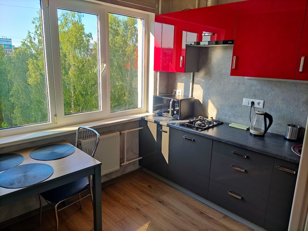 Die Wohnung besteht aus einem Schlafzimmer und einem geräumigen Wohnzimmer. Wohnzimmer mit Küche ist perfekt, um nach einem langen Tag zu entspannen. Balkon/Terrasse ist perfekt für Morgentee oder Kaffee. Es befindet sich in einem frisch erschlossenen Geschäftsbereich 10 Autominuten vom Stadtzentrum und 10 Gehminuten von einer Bus- oder Straßenbahnhaltestelle entfernt. In der Nähe der Wohnung befinden sich auch ein Restaurant, ein Einkaufszentrum und ein Kinderspielplatz. Die Wohnung ist geeignet für Paare, Familien mit Kindern und Freunden.