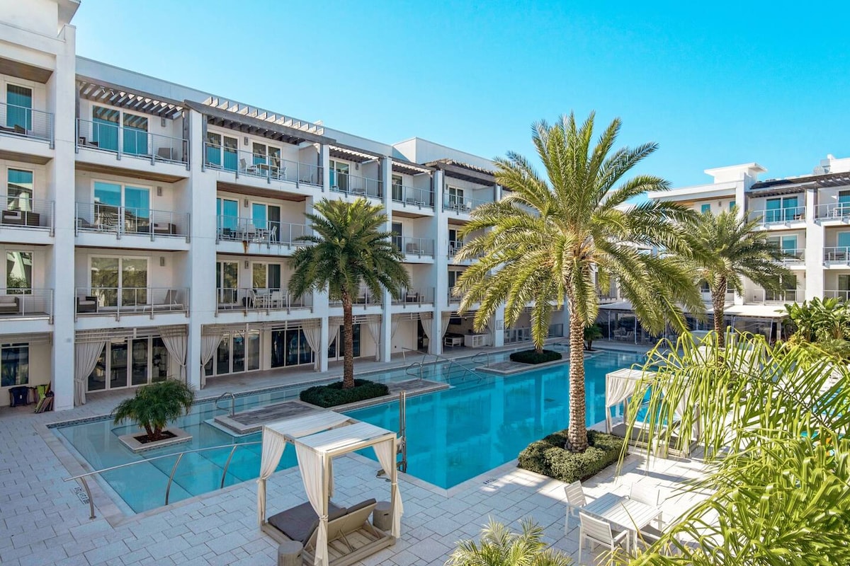 5 min walk to beach! **PLEASE READ ENTIRE LISTING B4 BOOKING. Paradise awaits at this beautiful 2 bedrm 2 bath top floor condo, situated at the highly coveted and recently built luxury resort The Pointe, located exactly next door to Rosemary Beach. This impressive and ideally located boutique resort boasts a lovely tropical pool, hot tub with outdoor fireplace, on-site café Big Bad Breakfast, poolside lounge, Rooftop Lounge with a spectacular view, & a well equipped gym overlooking the pool.