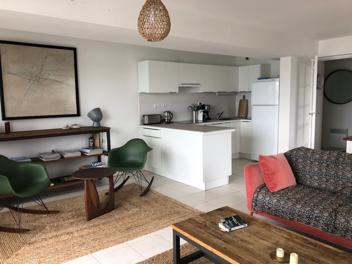 Kürzlich renoviertes Bauernhaus, das zum Herrenhaus am Meer gehört. Geschmackvoll eingerichtet vom Eigentümer (Maler und Architekt) - komplett ausgestattet mit allem, was man im Urlaub braucht - komfortable Schlafzimmer mit eigenen Badezimmern, nach Westen ausgerichtete Terrasse mit Grill, Waschmaschinen und Waschmaschinen. Sonniges und geräumiges Wohnzimmer. Télévision, Internet, Musikanlage. Das Meer 3 Minuten zu Fuß entfernt. Charmantes Dorf mit Markt und Supermarkt 4 Minuten Fahrt vom Haus entfernt. Golfplatz 10 Autominuten entfernt.
