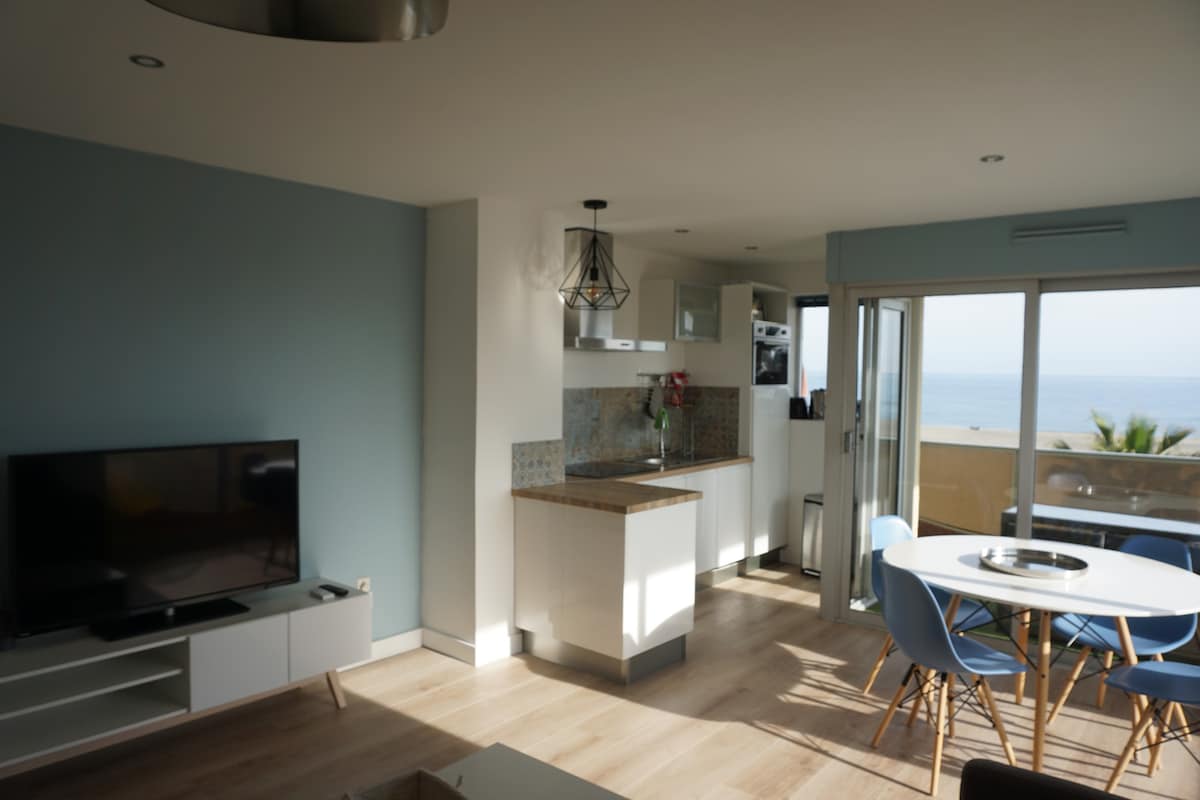 Geräumige 2-Zimmer-Wohnung direkt am Meer mit eigenem Parkplatz, geschmackvoll renoviert. Sehr gut ausgerichtet, Blick auf das Meer und die Berge. Kein Gegenüber. Ruhig, aber nah an allen Annehmlichkeiten, alles ist zu Fuß zu erreichen. Terrasse, voll ausgestattete Küche, Elektrogrill, Gartenmöbel, TV, WLAN-Internet. Hochwertige Betten mit echten Matratzen im Schlafsofa. Das separate, ruhige und geräumige Zimmer bietet Platz für 4 Personen. Fahrradraum.