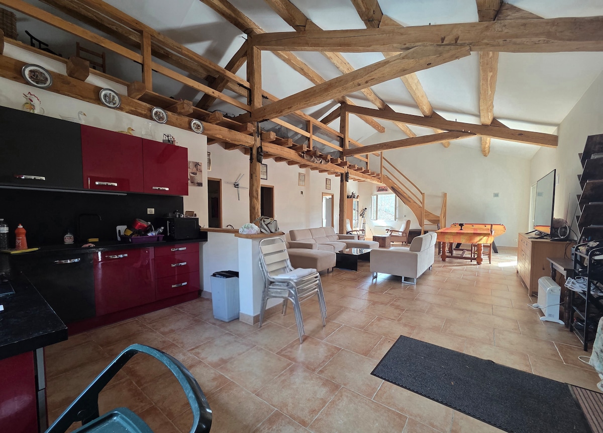 Nichée en pleine nature, cette maison offre un cadre authentique et apaisant, idéal pour se déconnecter du quotidien. Son architecture atypique avec poutres apparentes et grands volumes crée une atmosphère chaleureuse et pleine de charme. La terrasse et les ouvertures offrent une vue dégagée sur la nature environnante, parfaite pour profiter du calme et des paysages à toute heure de la journée. Ici, pas de bruit, pas de vis-à-vis : juste le calme, l’espace et une vraie sensation de refuge.