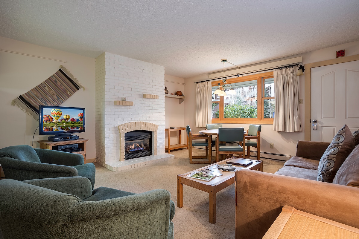 Ski condo only 5 minutes ride to ski mountain on free bus at condo complex and short drive to downtown. Hot tub out back door! King bed in private bedroom. Updated bathroom 2025 and new flooring throughout condo. -Full size, well stocked kitchen with regular & Keurig Coffee -Living room with New Gas Fireplace, leather reclining sofa, 50 inch TV, high spd WiFi, cable and streaming (Netflix, Amazon Prime, HBO Max). -Washer/Dryer in unit -Free Bus Stop: short walk from condo door -Ski Locker