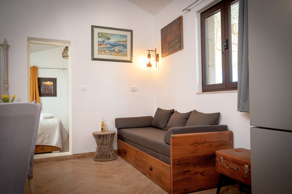 Die 60 m 2 Wohnung besteht aus einem Schlafzimmer mit einem großen Doppelbett, einem Badezimmer, einem geräumigen Wohnzimmer mit einer Küche, einem Vorraum und einem Balkon. Die gesamte Südwand zum Meer ist in Glas, sodass die Unterkunft viel Licht hat und mit einem Balkon einen Platz ausmacht. Die Wohnung befindet sich im dritten Stock des Hauses, das sich in der Nähe des Stadtzentrums befindet (5 Minuten angenehmer Spaziergang entlang des Meeres) und vom Balkon aus hat einen offenen Blick auf das Meer und die Inseln, da sich das Haus in der ersten Reihe am Meer befindet.