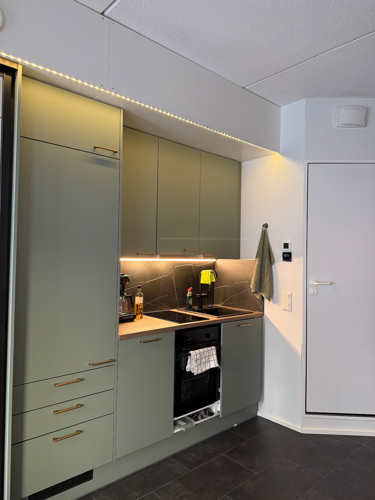 This compact studio lies in the Ruka Valley between the slopes 16 and 18, next to gondola and Family Park. A true ski-in/ski-out. 3 restaurants & ski rental about 100 meters. 1 Queen size bed + 1 good quality divan sofa bed. Bathroom and compact kitchen with dishwasher. Floor 2/2, private entrance. Full size cabinet dryer. More info in the photo captions! NOTE! You need to bring your own bed linen etc, and clean the apartment to same level it was on your arrival. Free WiFi.