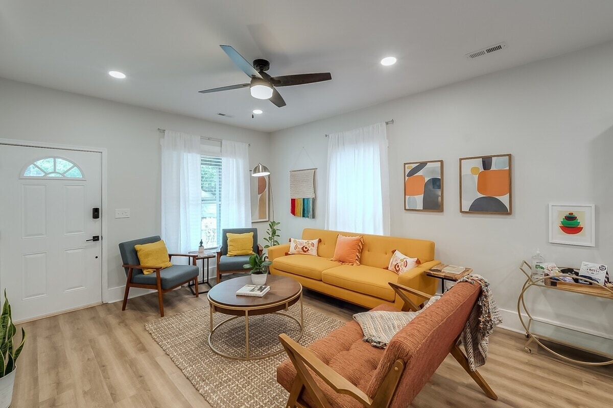 This dreamy getaway is located in the heart of Lexington's NoLi district where you can walk to breweries, boutiques & restaurants. Enjoy luxurious bedding & modern amenities while relaxing with family & friends. Our chef's kitchen features stainless cookware, quartz countertops & a granite island. Guests will enjoy our hi-speed wifi, a 55" smart TV in the living room & 43" smart TVs in each bedroom for streaming your favorite apps. Check-in easily w/ keyless entry.
