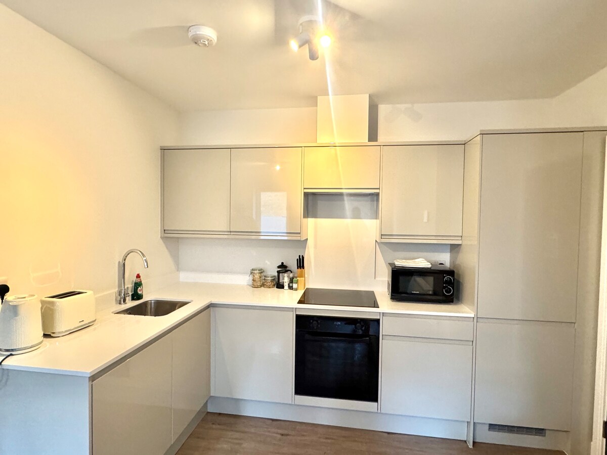 Brand-new ground-floor Flat in the heart of Farnborough. Sleeps up to 4 guests with a king-size bed and a comfortable sofa bed. Features a spotless bathroom with bathtub and shower, fully equipped kitchen (stove, oven, microwave, fridge, French press), washing machine, and fast Wi-Fi. Self check-in for a smooth arrival. Just a short walk to the train station, shops, and restaurants. Paid parking conveniently located next door (£7/day). Perfect for business or leisure stays.